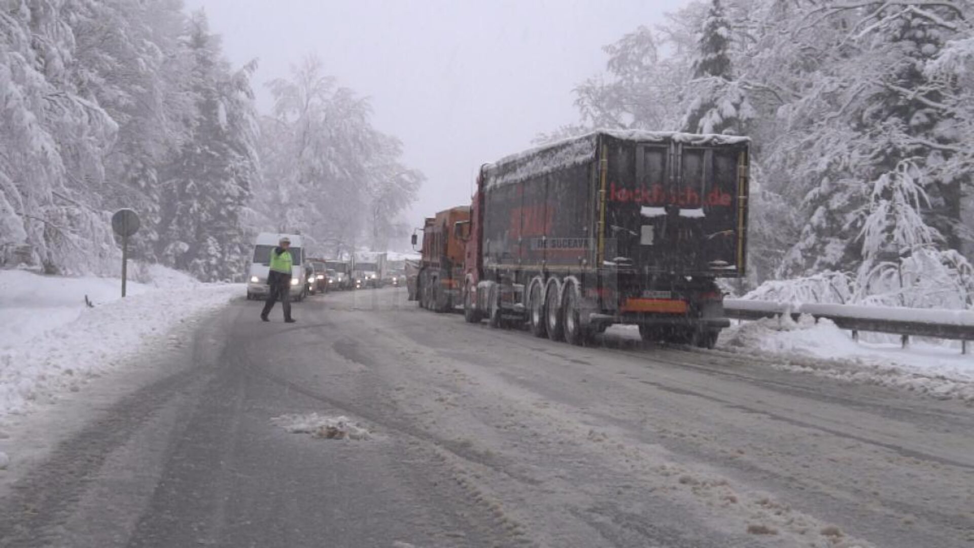 Ninsorile căzute joi dimineață au îngreunat mult traficul de pe DN 17, care leagă Suceava de Ardeal. Probleme mari au apărut în zona de pădure dintre Ilișești și Păltinoasa, unde pe carosabil s-a așezat un strat consistent de zăpadă.Intervenția lucrătorilor de la Secția de Drumuri Suceava nu a fost promptă de la prima oră a dimineții, astfel că multe vehicule grele nu au putut înainta, creându-se ambuteiaje.Poliția Rutieră a instalat un filtru la ieșirea de pe DN 17 la Trei Movile, unde echipajul rutier verifică dacă vehiculele sunt dotate cu cauciucuri de iarnă. Șoferii care au cauciucuri de vară la mașini sunt întorși din drum spre Suceava. Trafic în condiții veritabile de iarnă, cu blocaje temporare de circulație, s-a înregistrat și la ieșirea din Vama spre Câmpulung Moldovenesc. Peisajul din trafic a fost la prima oră a dimineții unul realmente hibernal, după cum se vede și în fotografia surprinsă de un participant la trafic. Pe DN 17A, în zona Palma, au fost introduse restricții de circulație pentru traficul greu.