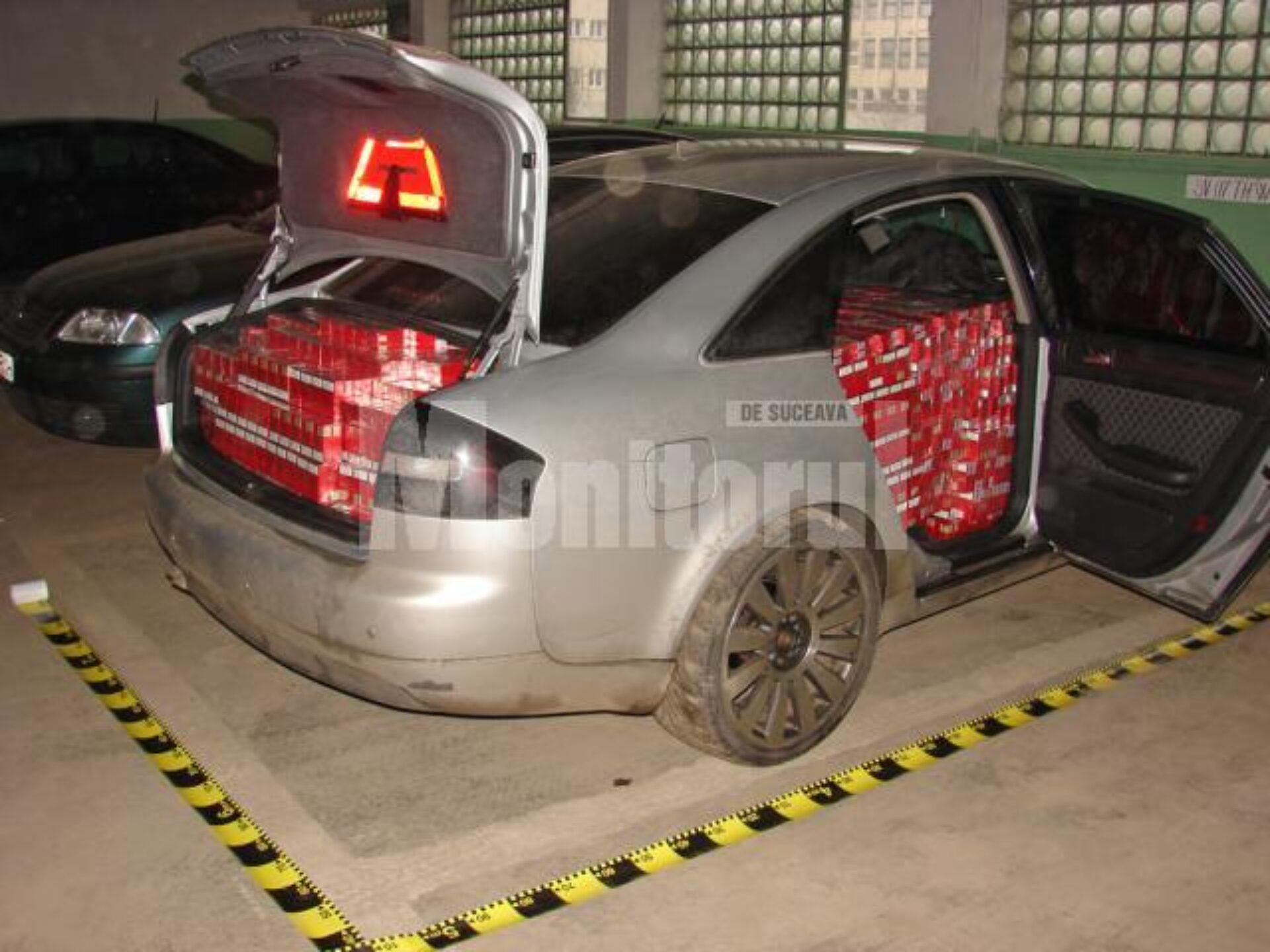 O captură de țigări de contrabandă mult mai mare a fost realizată în cursul zilei de ieri. În jurul orei 12.00, la intrarea în municipiul Suceava dinspre Siret a fost tras pe dreapta un autoturism Audi, condus de Emanuel P., în vârstă de 30 de ani, din Ploiești. Mașina era ticsită cu cartușe de țigarete, atât în portbagaj cât și în locul banchetei din spate, acestea din urmă fiind camuflate de foliile negre aplicate pe lunetă și pe geamurile laterale din spate. În total, șoferul transporta nu mai puțin de 12.100 de pachete de țigări fără acte, în valoare de 42.500 de lei.