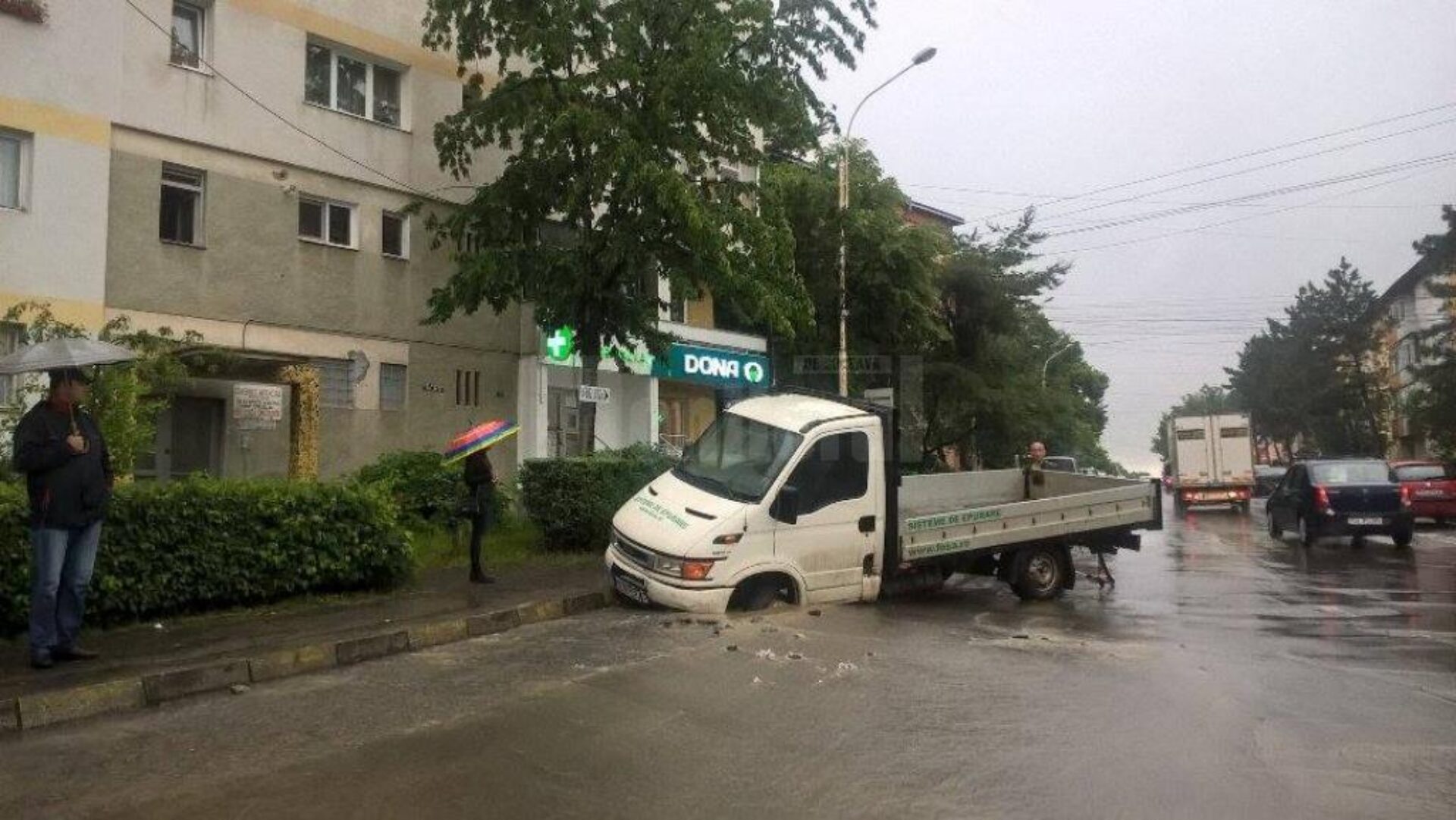 În municipiul Suceava, vineri dimineață, o autoutilitară s-a prăbușit în asfaltul care s-a surpat, pe strada Mihai Viteazul, lângă Policlinica Suceava.