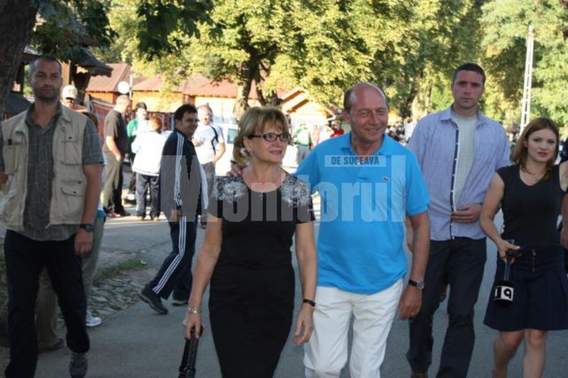 Ajunși la Mănăstirea Humorului, Traian Băsescu și soția sa au parcurs pe jos câteva sute de metri, din parcare și până la intrarea în mănăstire. Pe tot traseul parcurs, președintele suspendat a primit încurajări de la cei pe care îi întâlnea, o femeie urându-i „multă sănătate și bucurii”, în timp ce alta i-a spus „vrem să vă vedem înapoi la Cotroceni”.