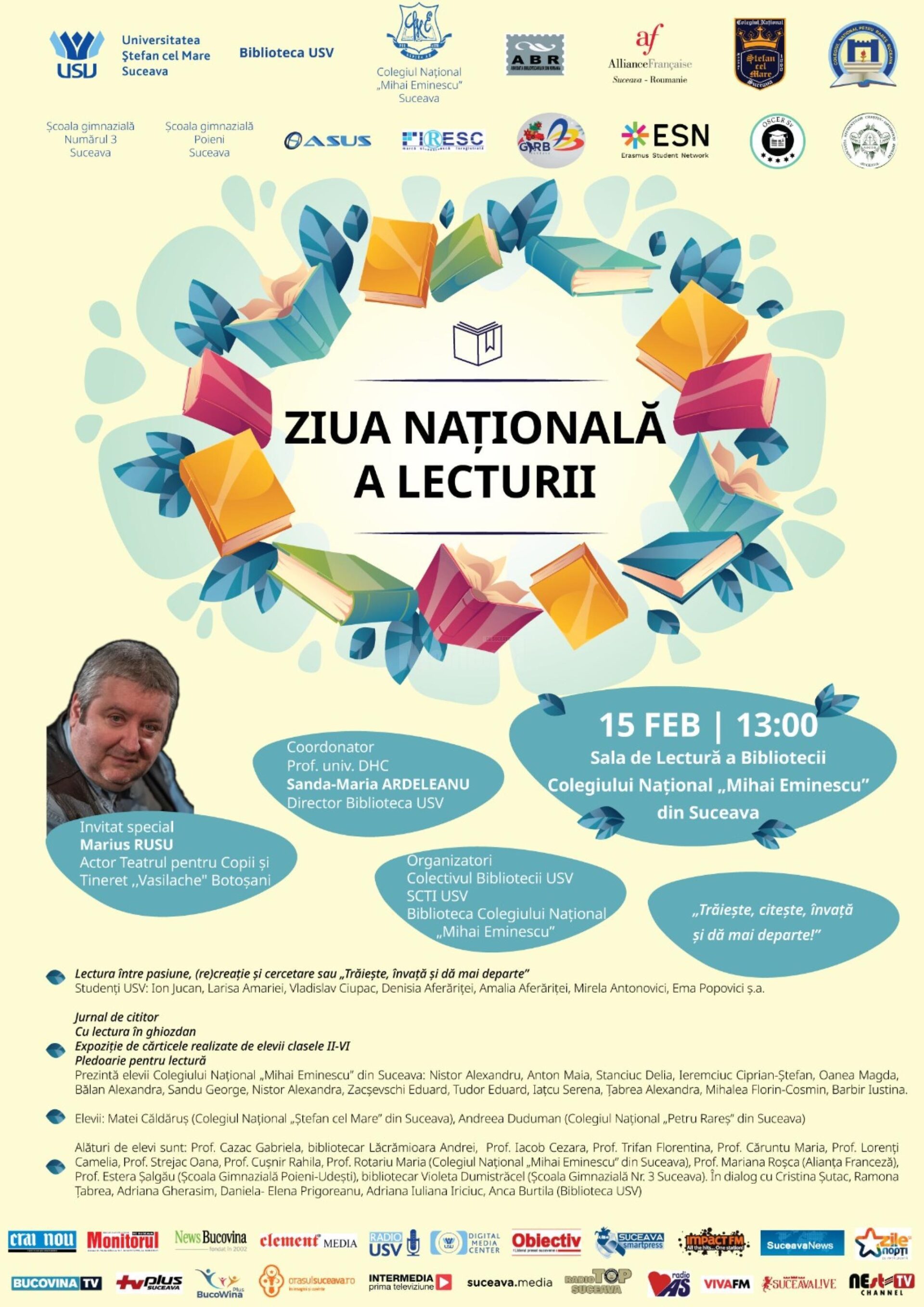 Ziua Națională a Lecturii va fi sărbătorită de către colectivul Bibliotecii Universității „Ștefan cel Mare” din Suceava, sub coordonarea directorului bibliotecii, prof. univ. dr. Sanda-Maria Ardeleanu, printr-o acțiune de împărtășire a bucuriei lecturii cu invitații evenimentului. „Trăiește, învață și dă mai departe” va fi tema întâlnirii ce va avea loc în Sala de lectură a Bibliotecii Colegiului Național „Mihai Eminescu” din Suceava, miercuri, 15 februarie, începând cu ora 13:00,întâlnire care va promova lectura între pasiune, (re)creație și cercetare. Desfășurat în format hibrid, la eveniment sunt așteptați actori, bibliotecari, profesori, studenți, elevi și iubitori de lectură.