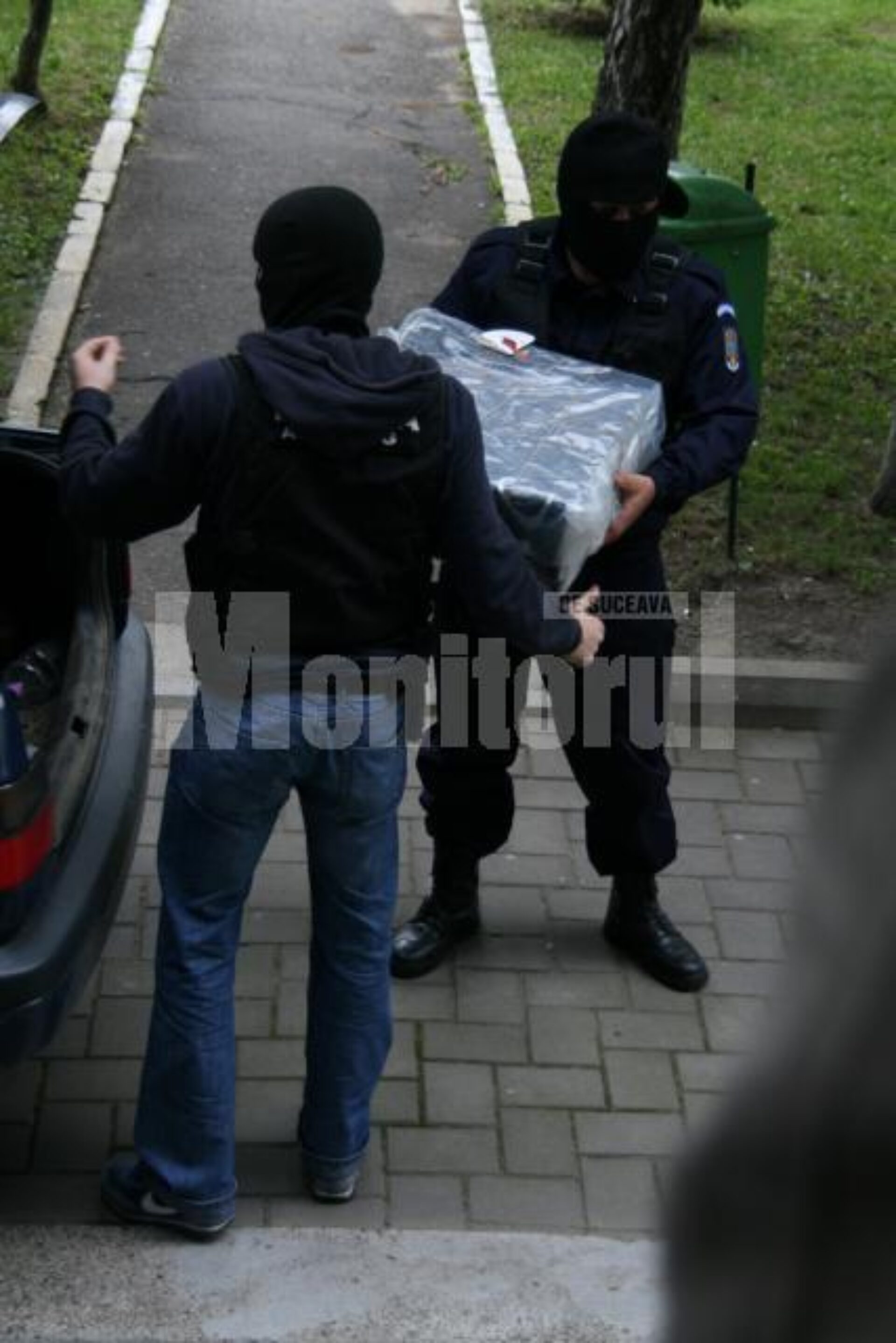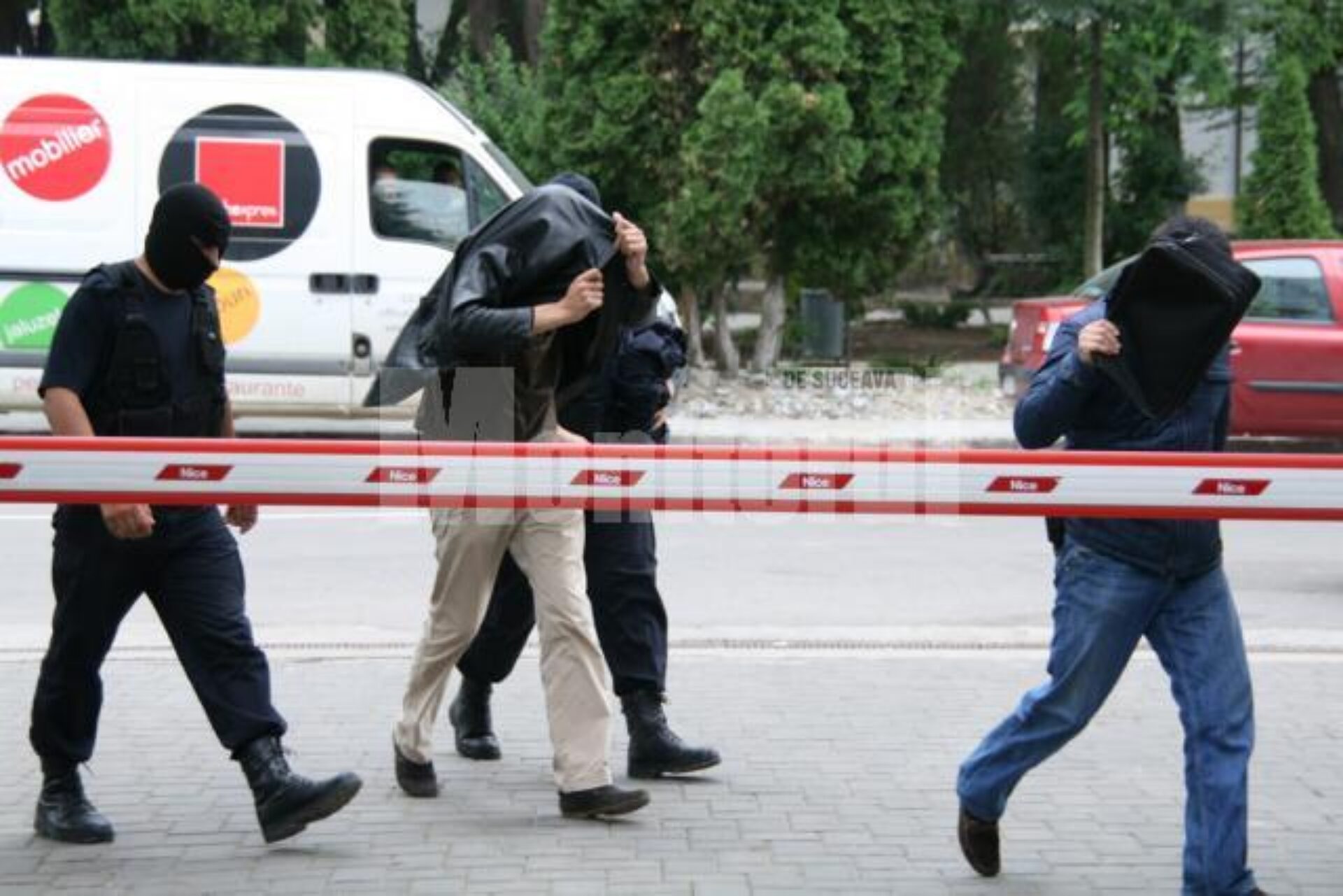 Încătușați și cu gecile în cap, cei nouă suspecți au fost aduși, pe rând, escortați de o armată întreagă de caguliști din cadrul Brigăzii de Combatere a Criminalității Organizate (BCCO) Suceava și Detașamentul Mobil al Jandarmeriei Suceava.