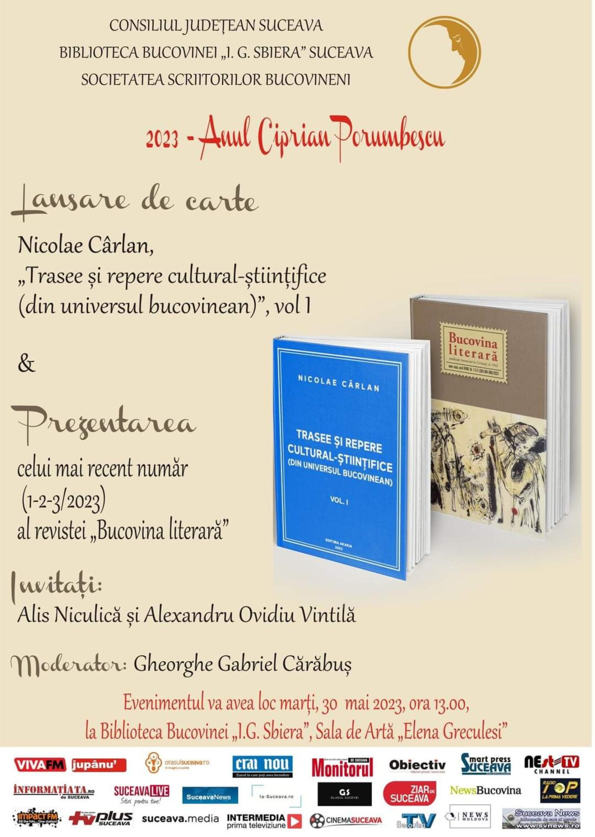La Biblioteca Bucovinei „I.G. Sbiera” Suceava, Sala de Artă „Elena Greculesi”, va avea loc marți, 30 mai 2023, la ora 13:00, lansarea Volumului „Trasee și repere cultural-științifice (din universul bucovinean)”, vol. I, de Nicolae Cârlan.