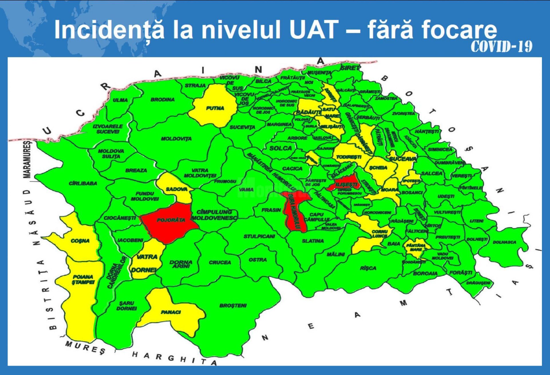 Singurele localități aflate în “scenariul roșu”, cu o incidență a îmbolnăvirilor de peste 3 la mia de locuitori sunt sunt Gura Humorului, Ilișești și Pojorâta.