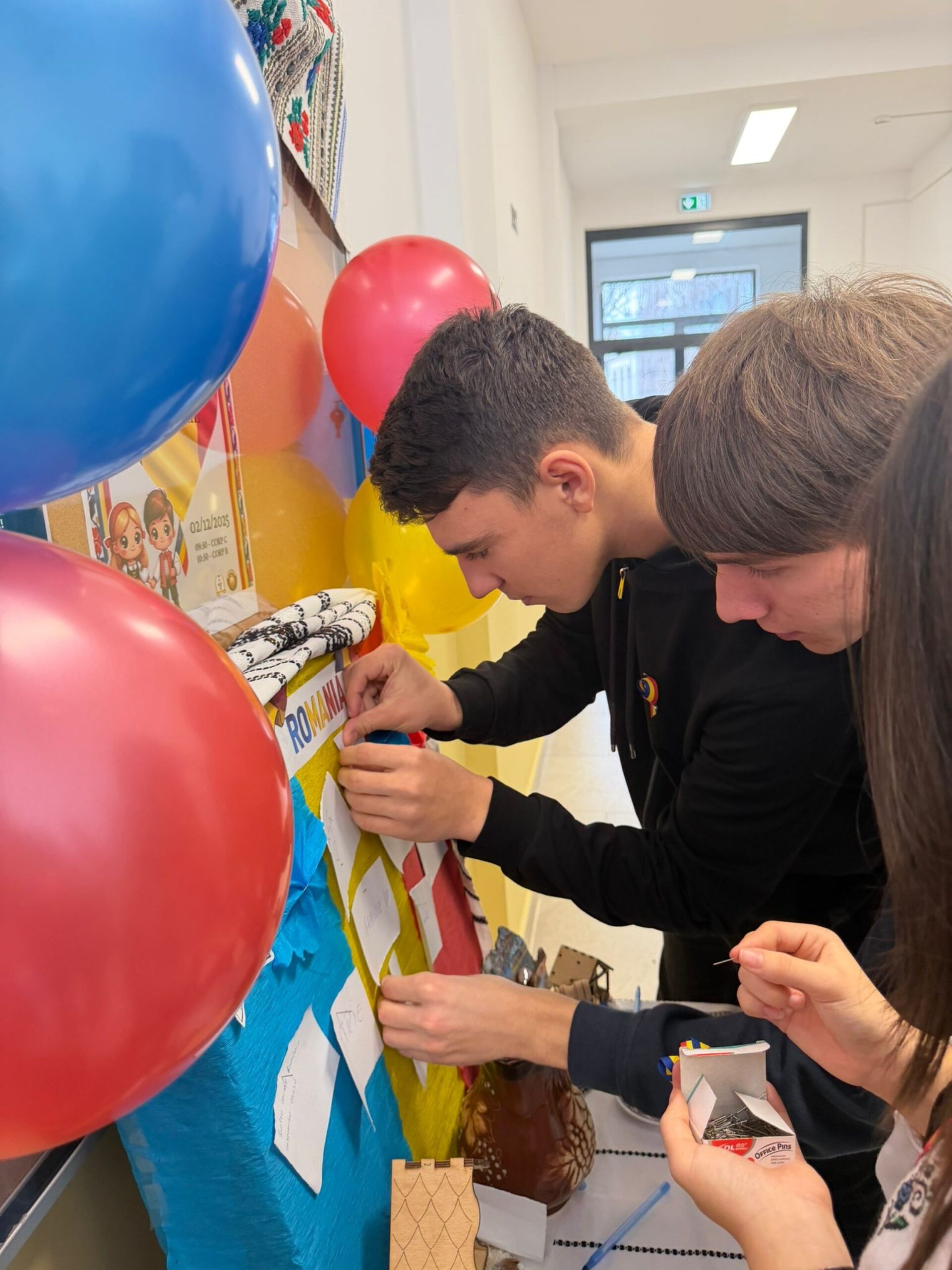 „Astăzi am sărbătorit Ziua Națională a României în liceul nostru. Noi, membrii Consiliului Școlar al Elevilor, am fost prezenți în pauze, atât la corpul C, cât și la corpul B, unde elevii s-au adunat pe holuri. Le-am oferit simbolic broșe tricolore confecționate manual de noi și am cântat împreună imnul. De asemenea, am împărțit bilețele pe care elevii au putut scrie ce înseamnă România pentru ei — mesaje pe care le-am afișat apoi pe un panou special amenajat. Și, bineînțeles, am făcut și fotografii.