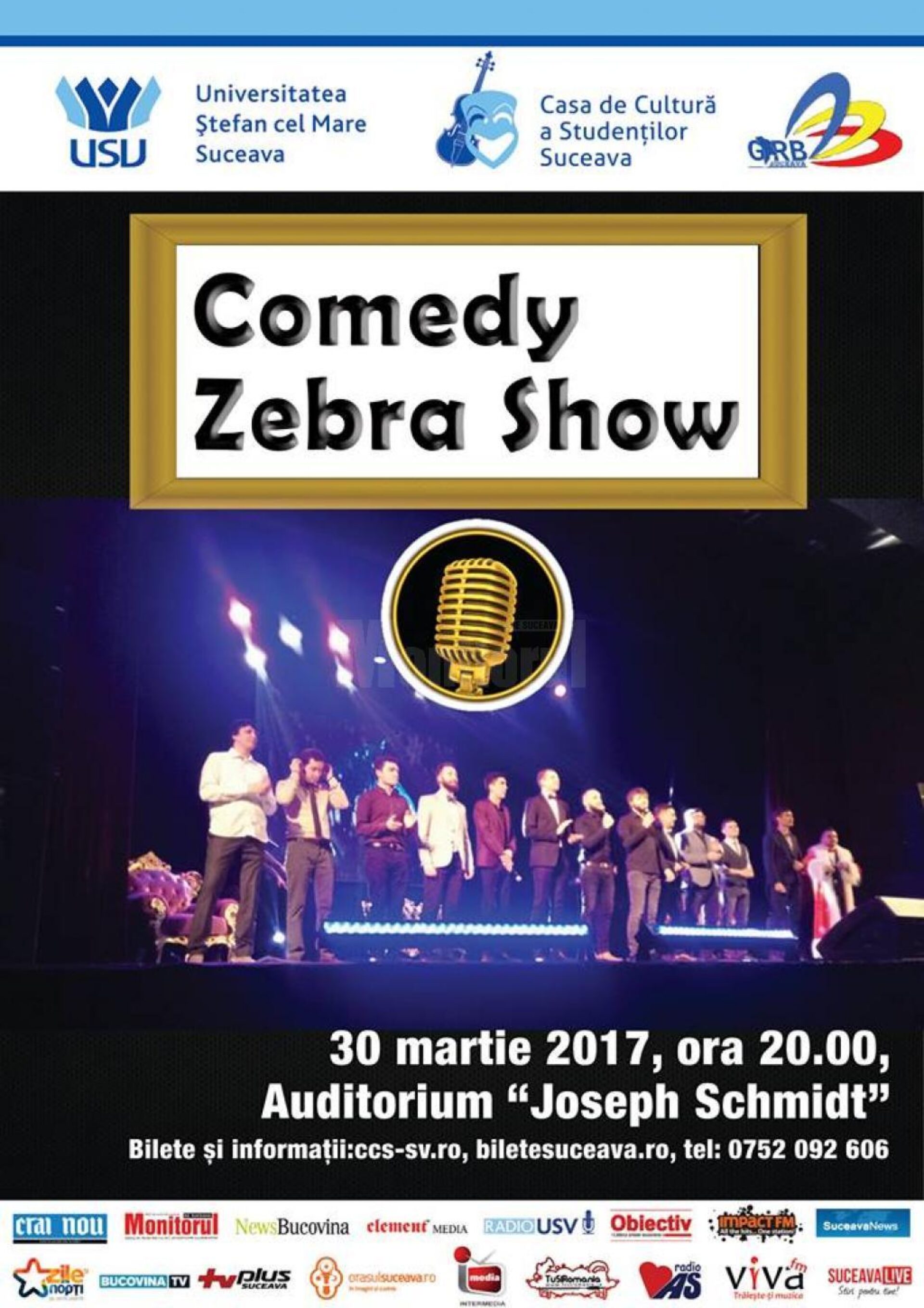 Trupa de umor Comedy Zebra Show va susține un spectacol la Suceava, la finele lunii martie. Evenimentul este organizat de Casa de Cultură a Studenților din cadrul Universității din Suceava, fiind programat pentru data de 30 martie, de la ora 20.00, pe scena Auditoriumului „Joseph Schmidt”. Comedy Zebra Show este un grup de umoriști din Republica Moldova, care a devenit cunoscut după mai multe apariții în cadrul emisiunii ”iUmor”, de pe Antena 1, cu numere complexe, alcătuite din mai multe secvențe de comedie, muzică și scenete. Costul unui bilet este de 10 lei sau 5 lei pentru elevi, studenți și pensionari. Bilete online pe www.ccs-sv.ro/www.biletesuceava.ro sau de la Observatorul Astronomic (luni-vineri, 10:00-12:00) și de la membrii organizației GIRB ai USV. Informații suplimentare la telefon 0752 092 606.