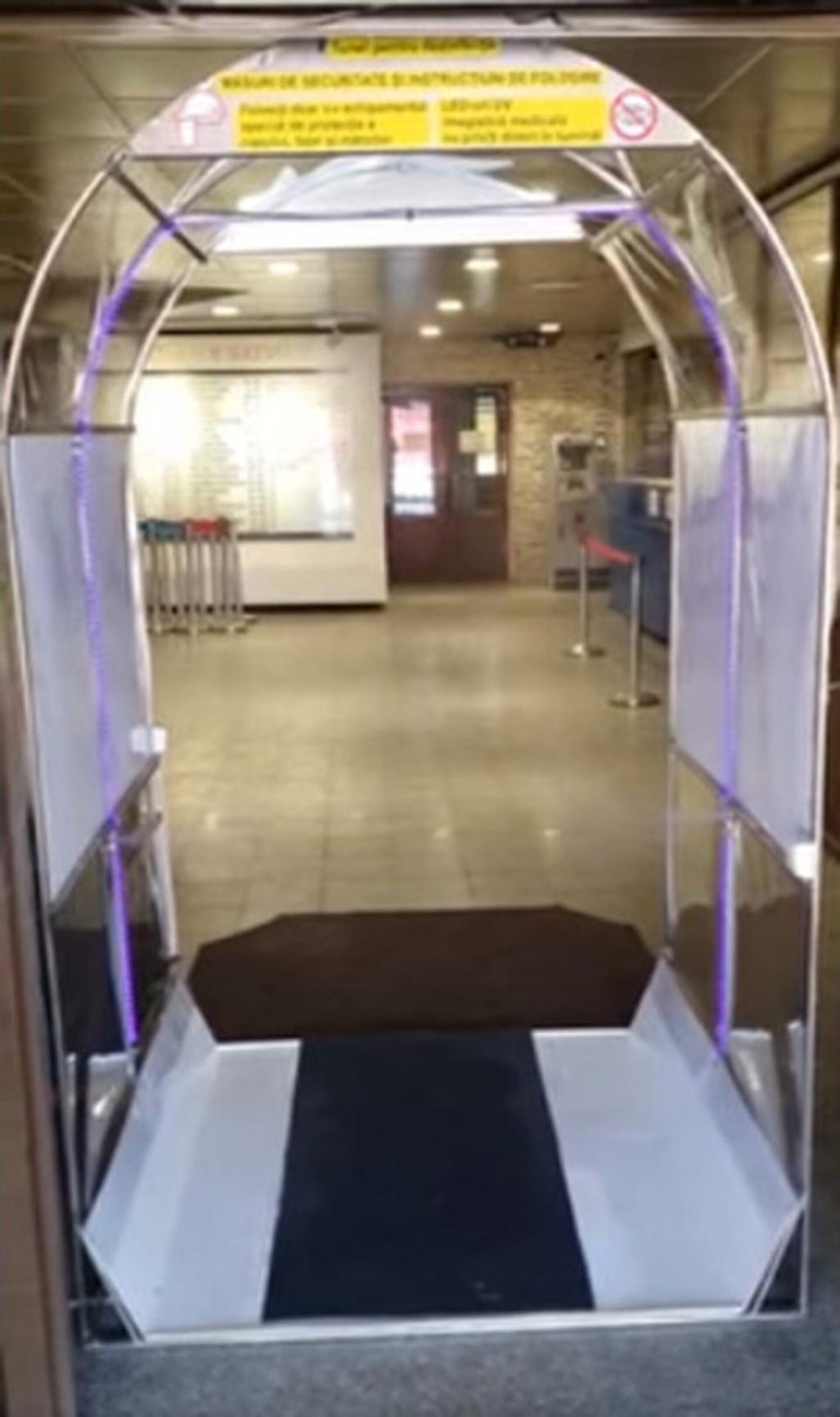 Tunelul de decontaminare, asemănător celor utilizate de multe spitale din țară, are 8 surse de pulverizare concomitentă, ajustabile pe înălțime.