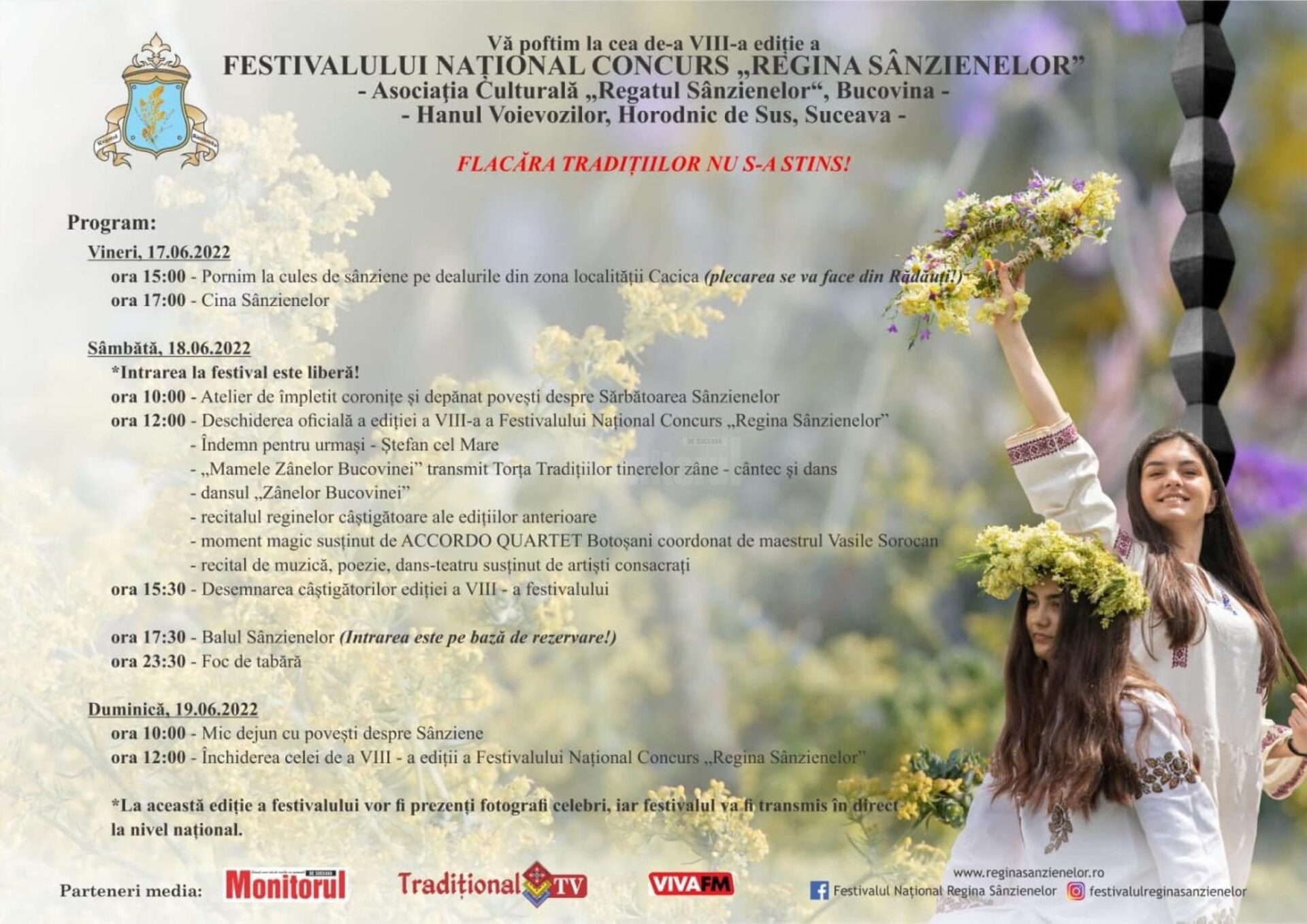 Înscrierile la Festivalul Național Concurs „Regina Sânzienelor”, ediția a VIII-a, continuă până pe 14 iunie. Evenimentul va avea loc, în perioada 18 – 19 iunie 2022, la Hanul Voievozilor din Horodnic de Sus, în „Regatul Sânzienelor”. Concursul se desfășoară pe mai multe secțiuni: Secțiunea Prințese (8 – 14 ani); Secțiunea Regine (15 – 101 ani); Secțiunea Grupuri; Secțiunea Costume inspirate din mitologia românească. „Pornim din nou într-o călătorie magică, emoționantă și educativă (a VIII-a), prin toate zonele etnografice ale României, printre cuvinte, cântece, obiceiuri inspirate de Sărbătoarea Sânzienelor, în dorința de a menține aprins focul sacru al tradițiilor noastre milenare.Timp de două zile, pe 18 și 19 iunie 2022, la Hanul Voievozilor din Horodnic de Sus, Suceava, în Bucovina noastră de poveste, vom aduna într-un buchet de sânziene tradiții și obiceiuri scoase din lada de zestre a poporului român, vom premia regine, prințese, grupuri, costume, vom cânta și vom dansa, celebrând și anul acesta zânele bune ale românilor, Sânzienele.Indiferent de vreme și de vremuri, avem datoria de a trăi frumos, de a ne respecta rădăcinile din care ne tragem seva. Să transformăm visurile în realitate și să ne mângâiem sufletele cu vibrațiile trăirilor noastre! Haideți să visăm împreună”, este mesajul organizatorului și suflet acestui festival, Dumitru Parasca, care, împreună cu soția sa Elena Parasca, speră că vor duce la bun sfârșit Festivalul Național Concurs „Regina Sânzienelor”, ediția a VIII-a (www.reginasanzienelor.ro),un eveniment emblematic pentru Bucovina, pentru România, prin popularitatea de care s-a bucurat în ultimii ani. Intrarea la festival este liberă.