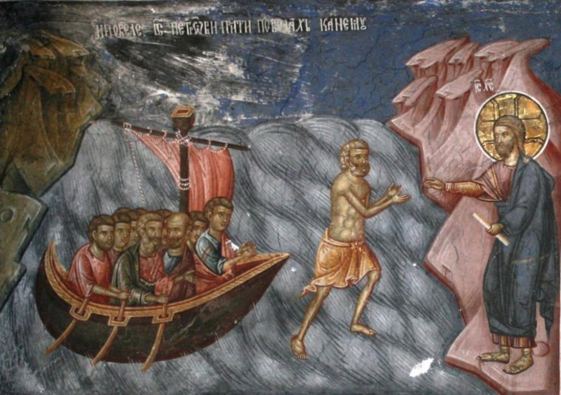 La un moment dat îi și întâmpină, nici nu știau de unde vine. Atunci Petru, zice: „Doamne, Tu ești?”. „Da, Eu sunt”. Tot nu i-a venit să creadă. „Dacă cu adevărat ești Tu, poruncește să vin până la Tine pe apă”. Și a zis: „Vino!”. Și s-a dat el peste buza corăbiei și a început să meargă pe apă, spre uimirea celorlalți, spre bucuria lui.