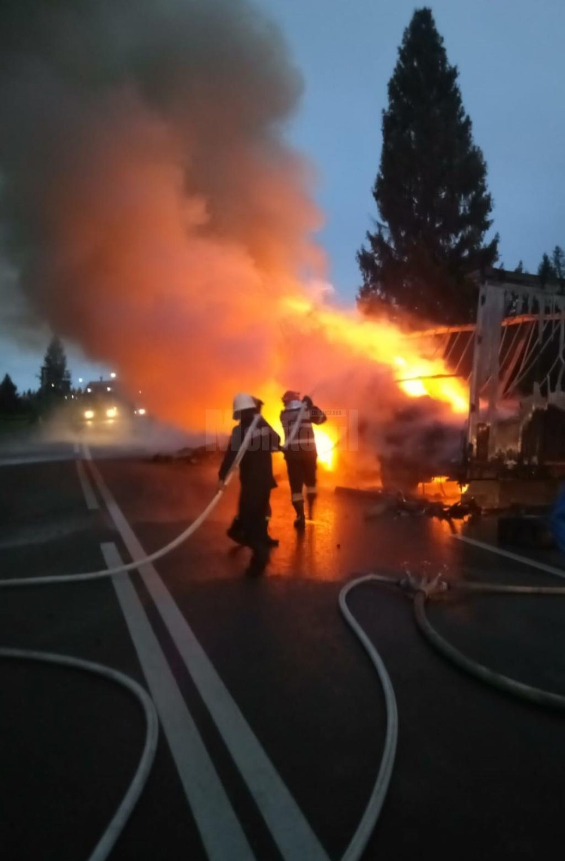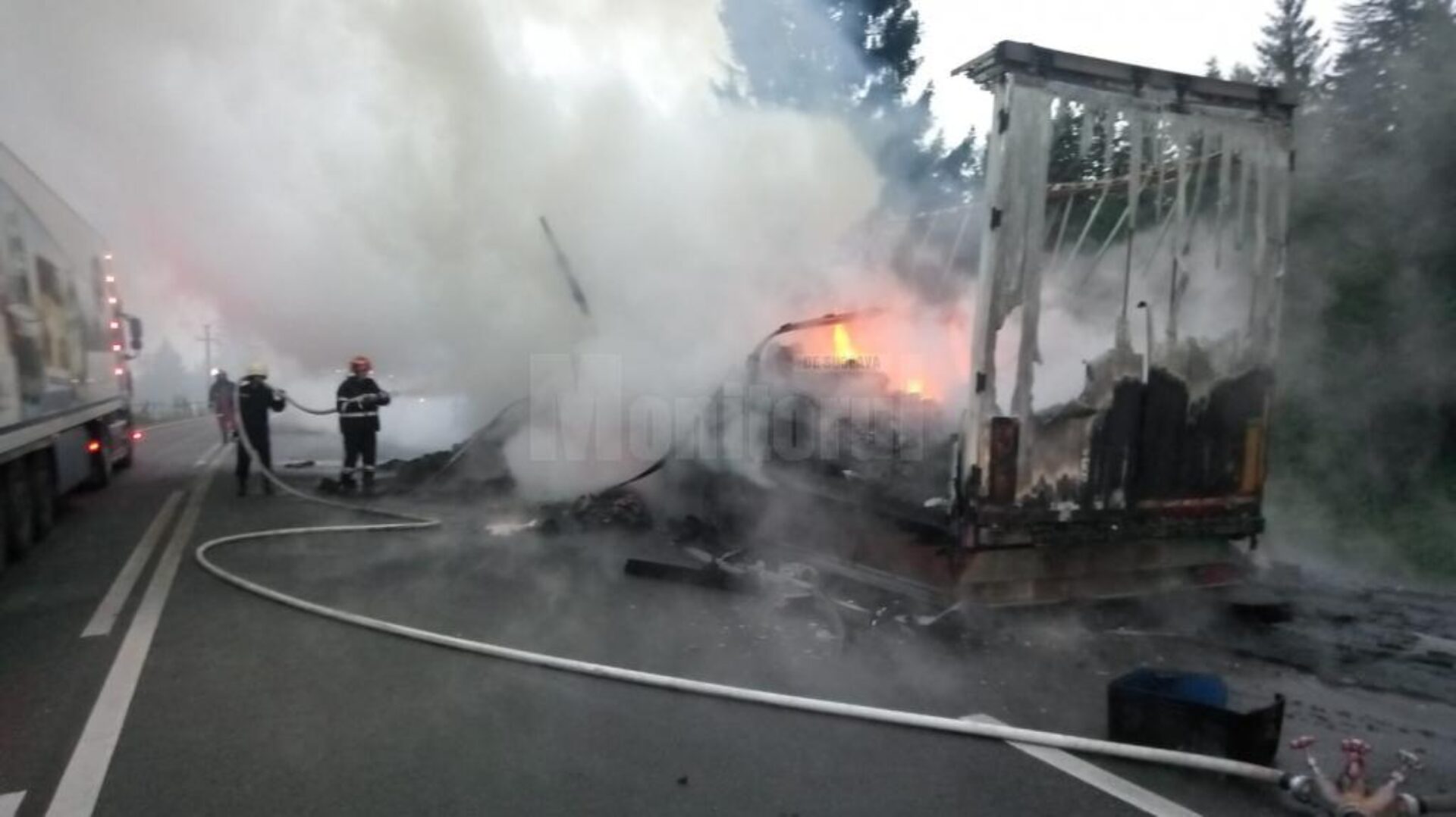 La sosirea echipajelor, ardeau generalizat capul tractor și remorca, cu pericol de propagare la fondul forestier.