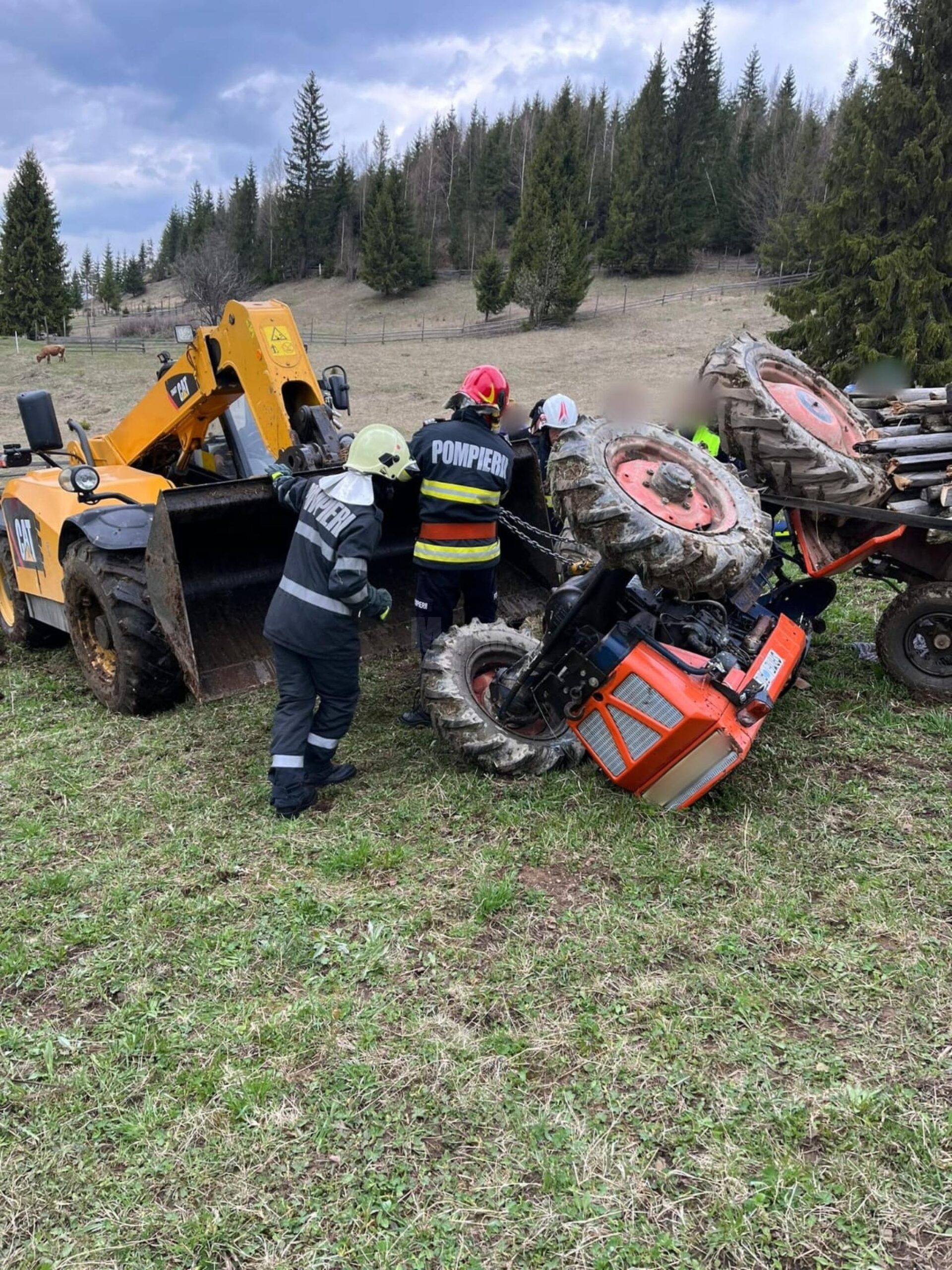 Pompierii militari ai Detașamentului Vatra Dornei au fost solicitați să intervină miercuri după-amiază, pe raza localității Poiana Negri, pentru extragerea unui bărbat (42 de ani) prins sub un tractor.