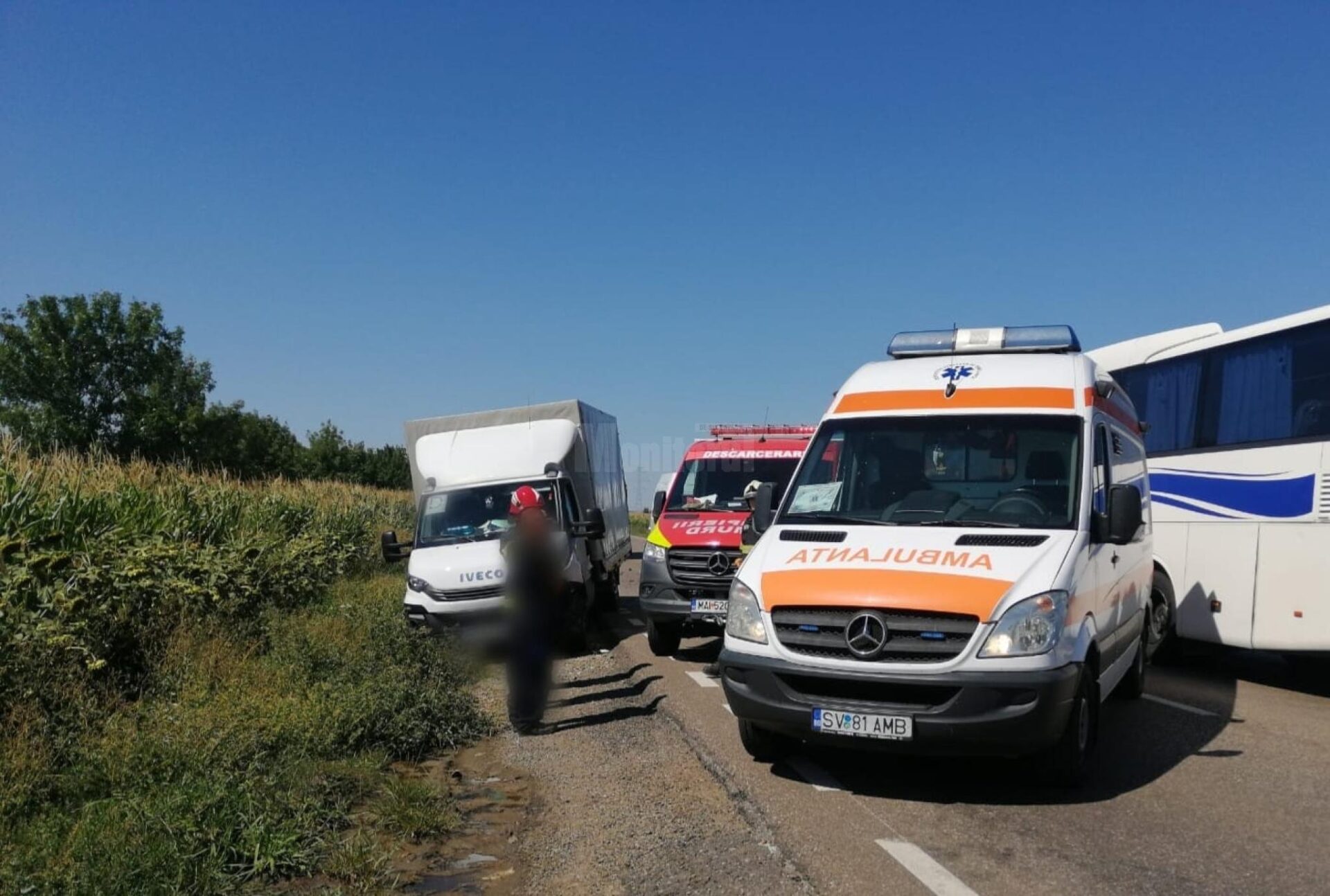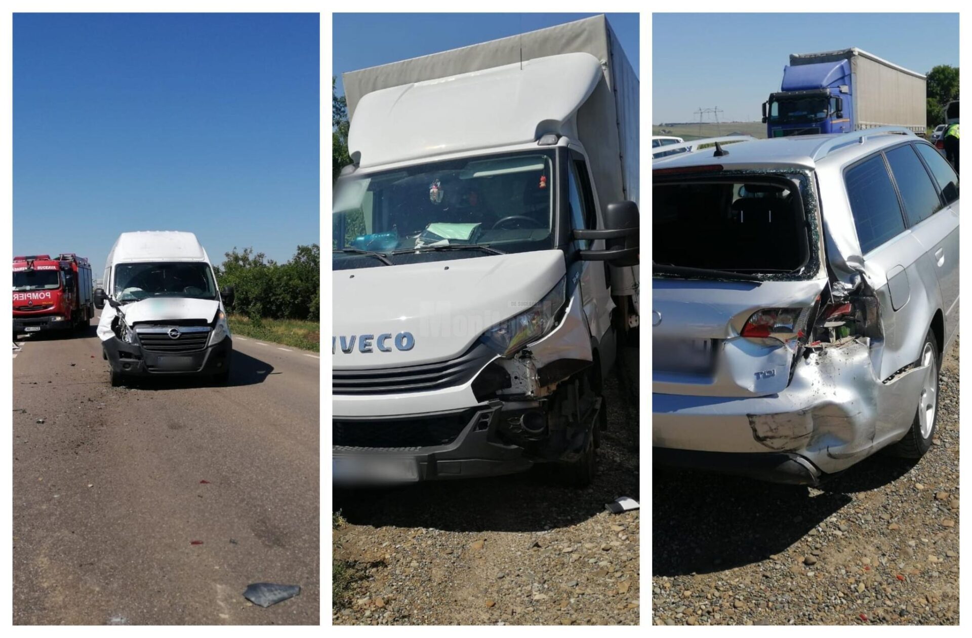 Un bărbat de 52 de ani a rămas încarcerat între fiarele contorsionate ale mașinii după un accident care a avut loc luni după-amiază, pe drumul european 85, în zona localității Cumpărătura. Două autoutilitare, una marca Iveco și alta marca Opel, au intrat în coliziune cu un al treilea autoturism, marca Audi. După ce a primit îngrijiri la fața locului, bărbatul extras din mașină a fost transportat la Unitatea Primire Urgențe a Spitalului Județean Suceava pentru tratament medical de specialitate.
