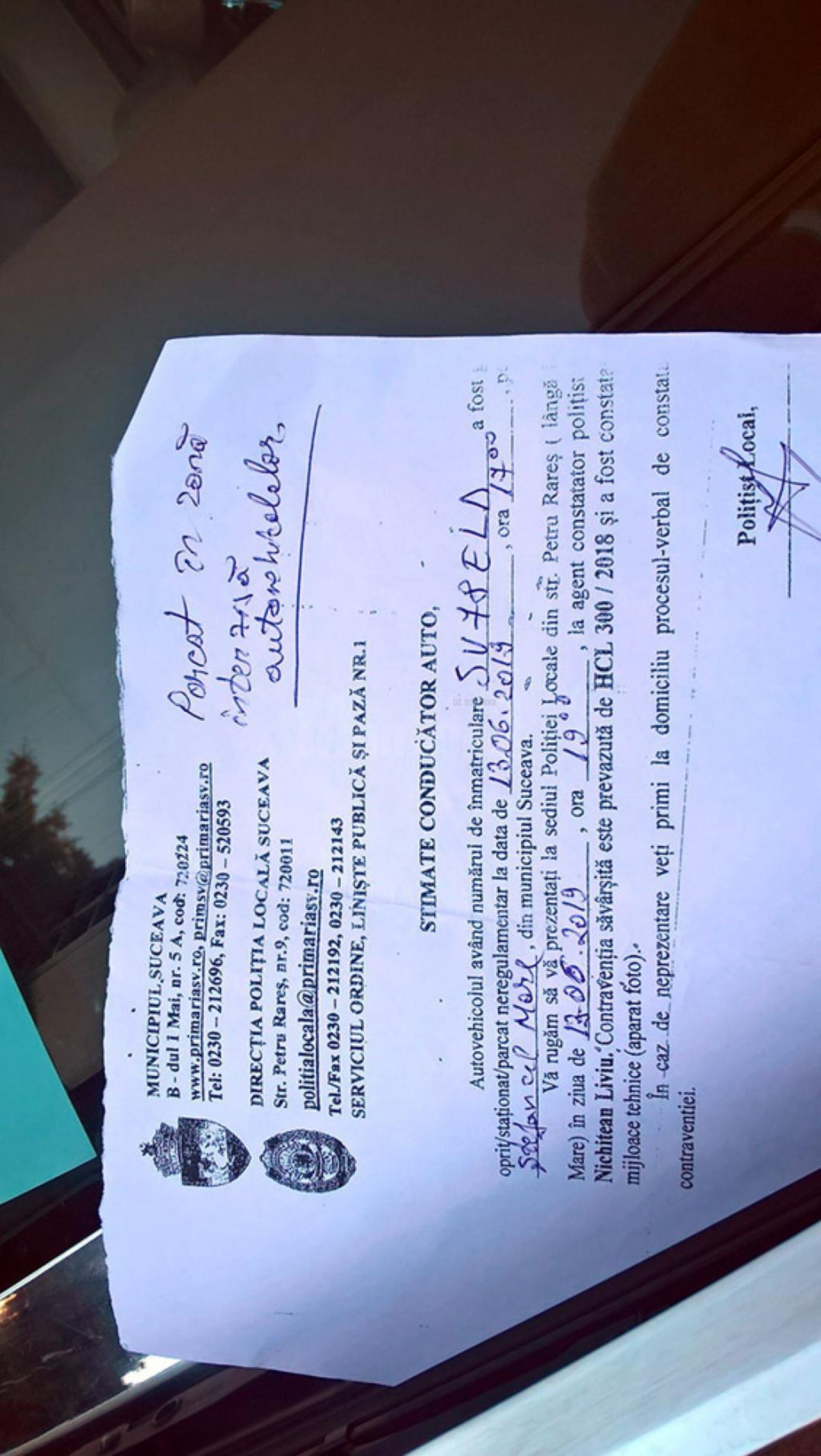 Mașina a fost luată la ochi în scurt timp de un echipaj de la Poliția Locală Suceava, care a lăsat pe parbrizul autoturismului o înștiințare cu privire la faptul că autovehiculul a fost parcat neregulamentar la data de 13 iunie, ora 17.00. Posesorul mașinii a fost invitat la sediul Poliției Locale, în caz contrar urmând a primi acasă procesul-verbal cu amenda privind parcarea în zona interzisă, cu precizarea din partea Poliției Locale Suceava că încălcarea HCL 300/2018 a fost constatată cu mijloace tehnice (aparat foto).