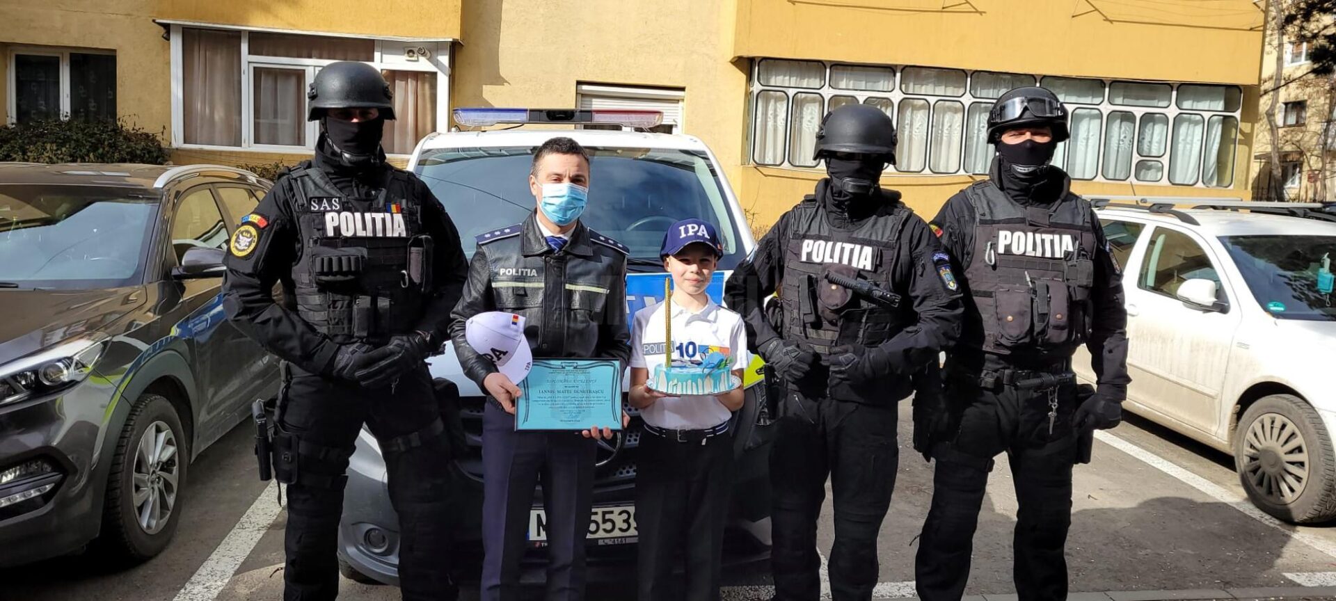 Polițiștii suceveni, în frunte cu ofițerul de presă Ionuț Epureanu, i-au pregătit o surpriză unui băiat în vârstă de 10 ani din cartierul Burdujeni al municipiului Suceava, care a avut parte de o aniversare pe care probabil că nu o va uita.