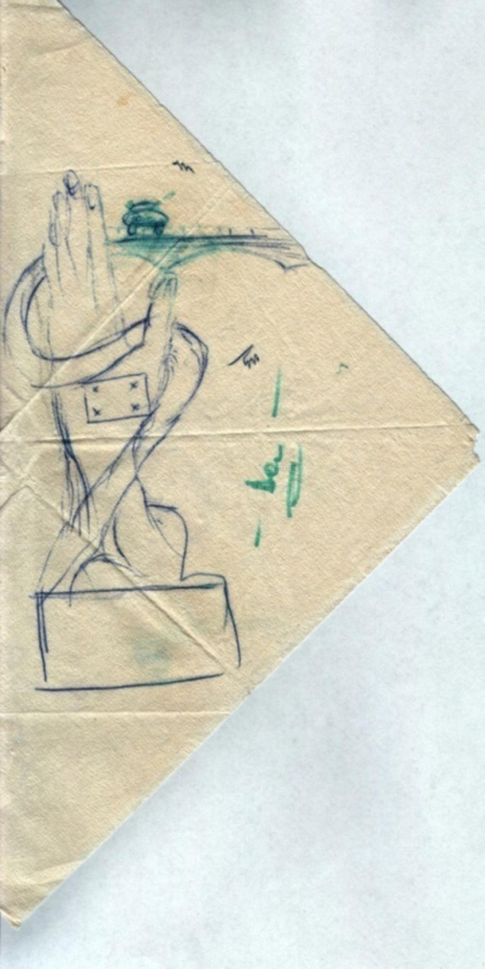 Pe șervețelul pe care a fost desenat monumentul se pot vedea foarte clar „ajustările” directorului ICT. Mașina de pe pod tăiată și aprobarea simbolică a proiectului – „Da” – realizate cu un stilou cu cerneală verde.