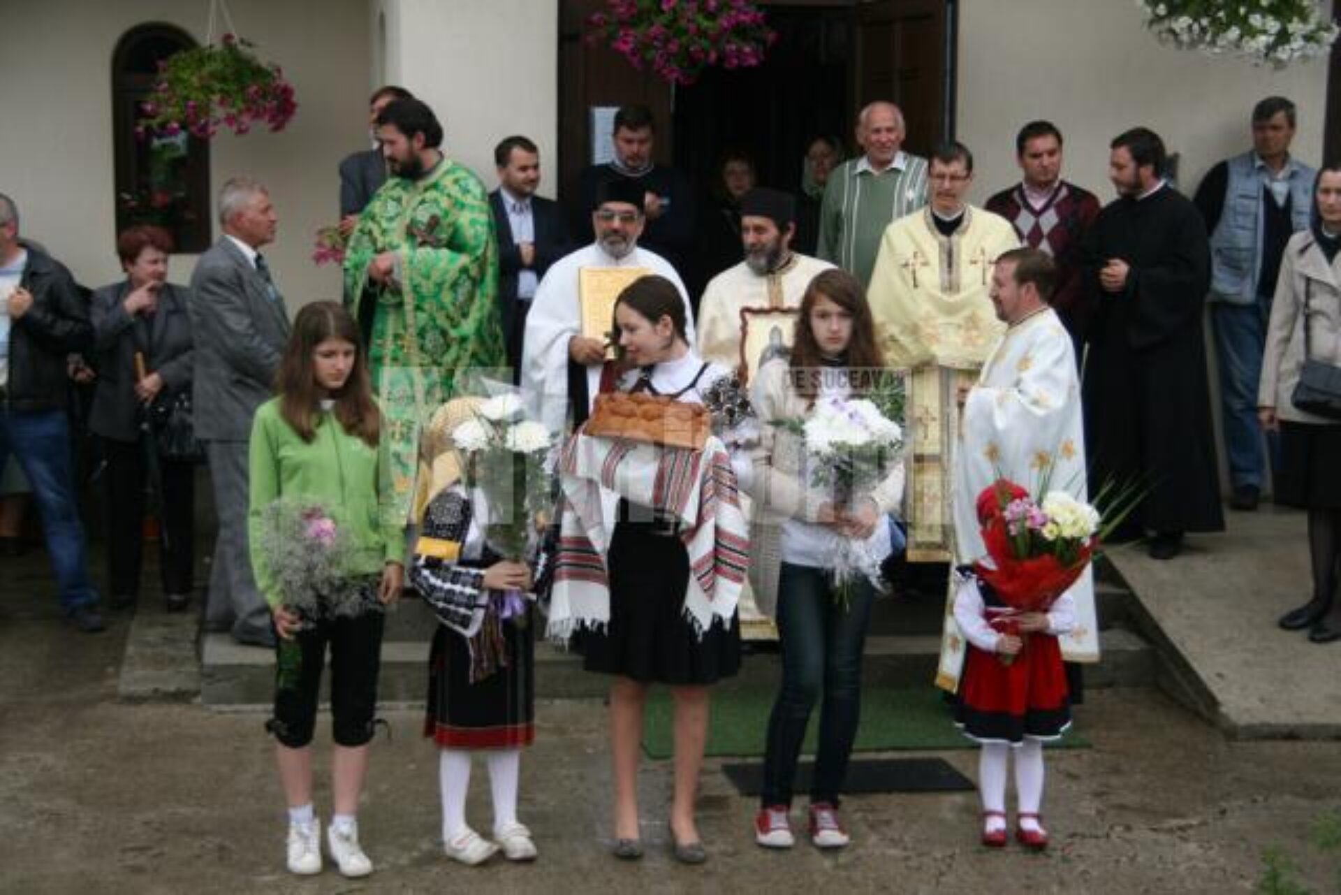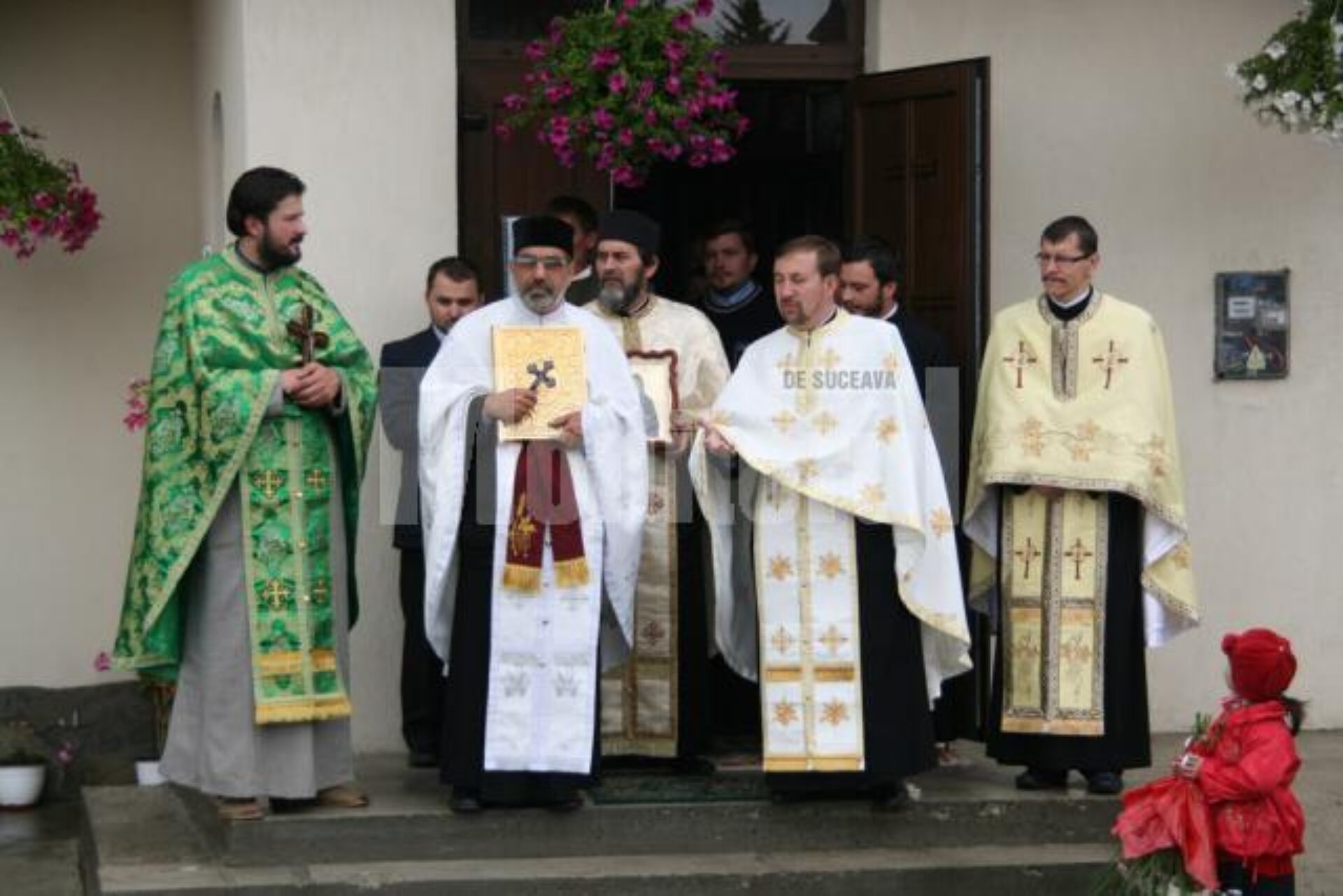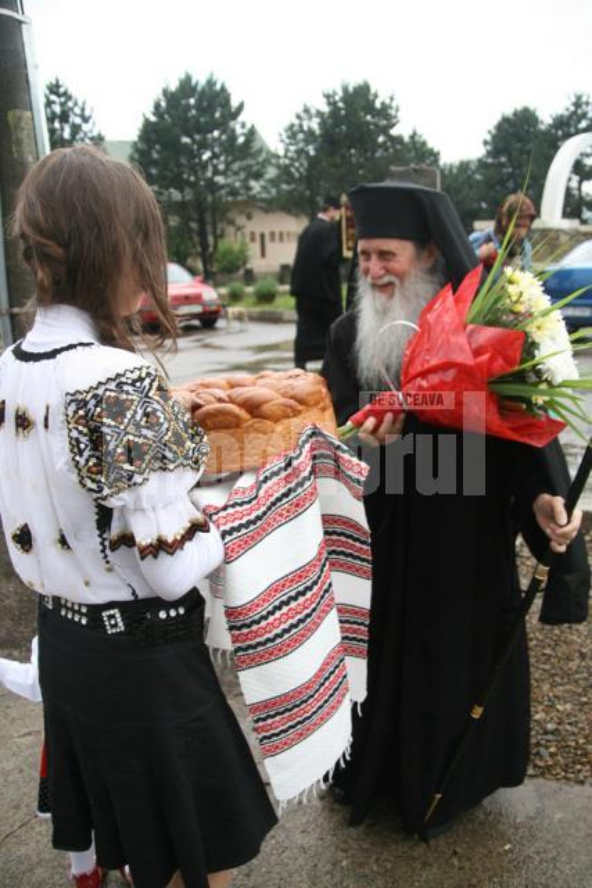 La ora 17:00, la Biserica „Sf. Petru și Pavel” a fost întâmpinat cu pâine și sare, după cum este obiceiul în Bucovina, ÎPS Pimen, Arhiepiscopul Sucevei și Rădăuților. Mai mulți copii și tineri i-au oferit flori arhiepiscopului sucevean. ÎPS Pimen a binecuvântat icoana adusă din Ucraina, în care se află un fragment din moaștele Sf. Iov de la de la Poceaev, după care a oficiat, împreună cu soborul de preoți, slujba Vecerniei. Înainte de începerea slujbei, un grup de tineri au interpretat un cântec religios în limba ucraineană.