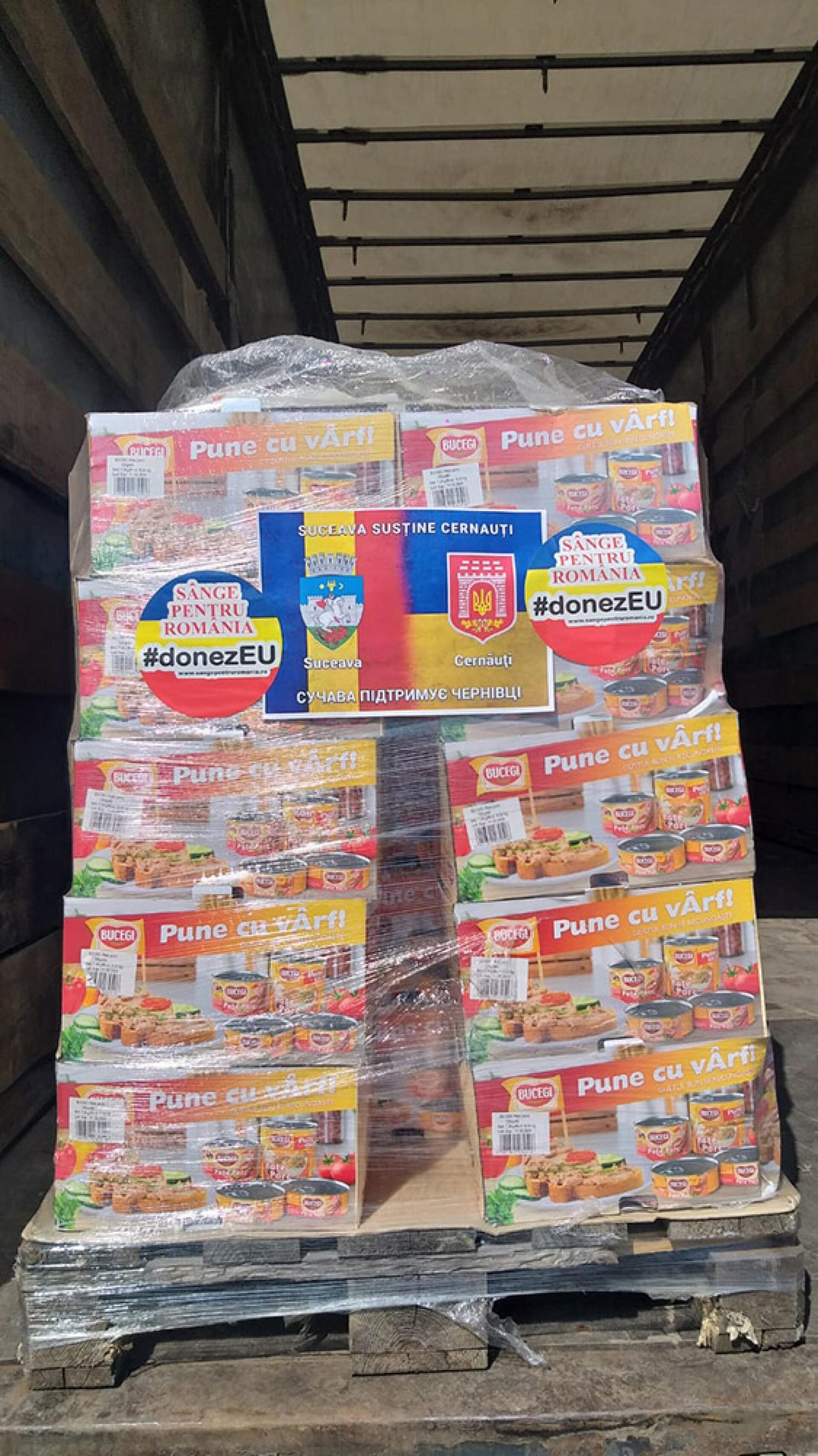 „Primăria municipiului Suceava a trimis un nou transport de ajutoare alimentare către Cernăuți în valoare de 33.766 lei, conținând aproximativ 4 tone de produse alimentare, respectiv: orez; făină albă; mălai; pate de porc Bucegi; tăiței.