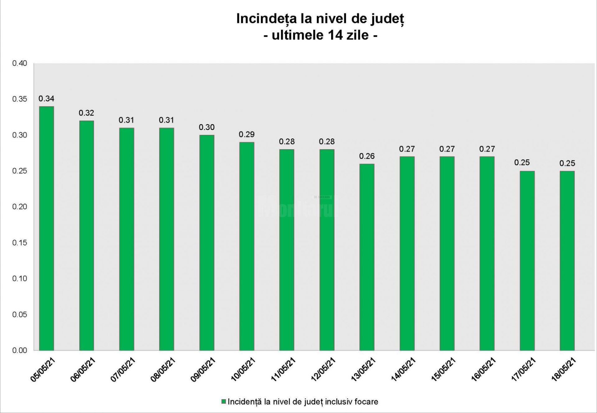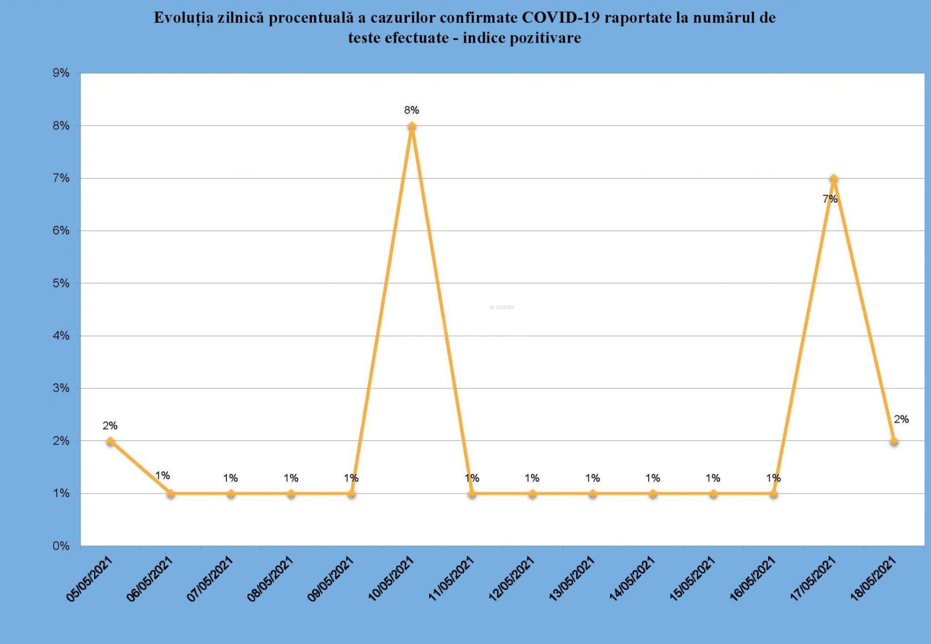 Din cele 114 localități, 54 nu au niciun caz de infecție Covid-19 în evoluție, 26 au câte un caz, 22 au sub cinci cazuri, 7 au sub zece cazuri, iar 5 au peste zece cazuri în evoluție. Incidența în municipiul Suceava este de 0,20 la mie, cu 32 de cazuri active, și a fost în scădere constantă în ultimele 7 zile. În perioada 5-18 mai indicele de pozitivare s-a menținut la 1 la sută, cu două vârfuri de 8 la sută pe 10 mai și 7 la sută pe 17 mai și două zile cu 2 la sută, pe 5 și 18 mai. Trei localități din județ, Dorna Arini, Fântâna Mare și Panaci, rămân în zona galbenă și una, Șaru Dornei, în zona roșie a incidenței.