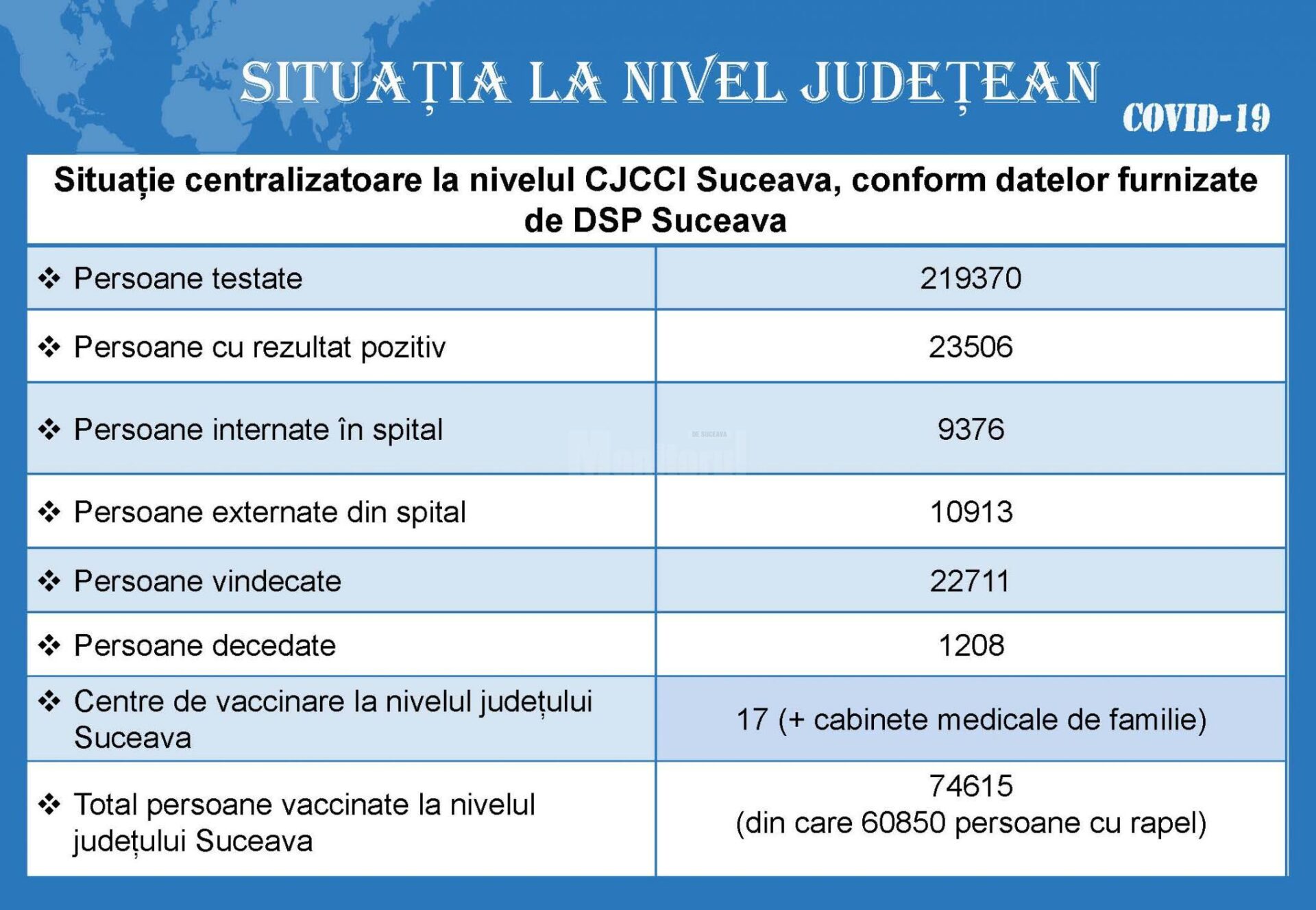 Numărul de persoane vaccinate la nivelul județului Suceava este de 74.615, din care 60.850 persoane cu rapel.