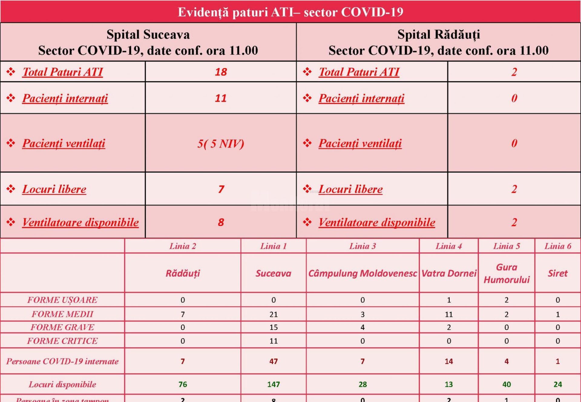 La Rădăuți, pe 84 de locuri erau 7 pacienți cu Covid, tot 7 fiind internați și la Câmpulung Moldovenesc, dar aici pe 35 de locuri. La Gura Humorului sunt 4 pacienți cu Covid, pe 44 de locuri, iar la Spitalul de Urgență Suceava sunt 47 de pacienți pe aproape 200 de locuri alocate pacienților cu Covid. Doar Spitalul Municipal Vatra Dornei are un grad de ocupare mai mare, cu 14 pacienți diagnosticați cu Covid-19 pe 27 de locuri.