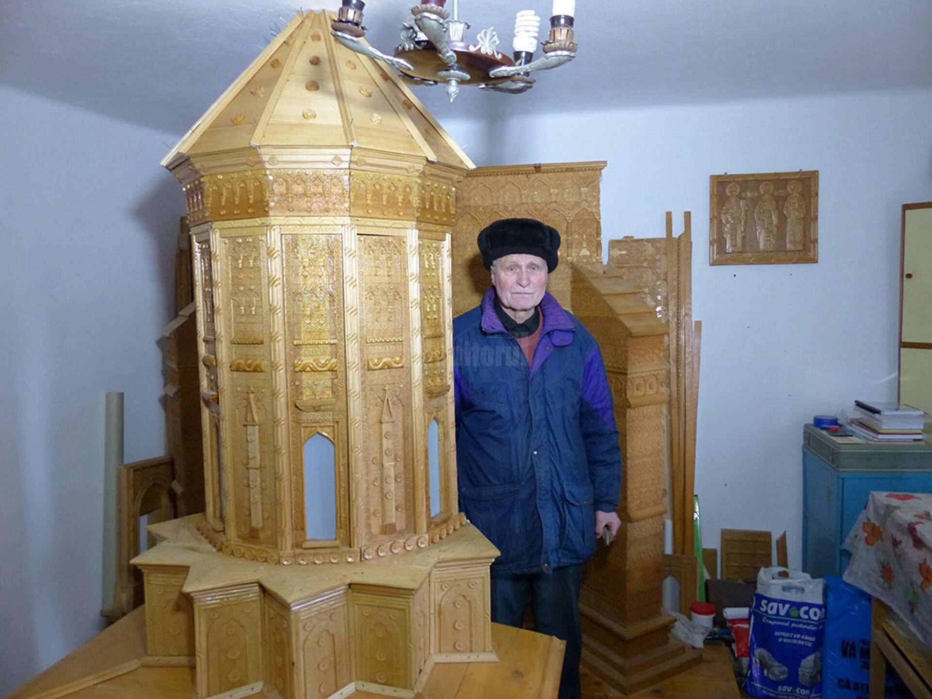 De mai bine de 30 de ani, artistul lucra la sculptarea în lemn a Bisericii „Sfinții Trei Ierarhi” din Iași, la o scară de 1:36. Pentru a vă face o idee mai exactă, bătrânul a realizat lucrarea pe bucăți, în diferite camere din locuință. Biserica sculptată pe lemn are o înălțime de aproximativ trei metri și urmărește în detaliu arhitectura exterioară unică a locașului de cult.