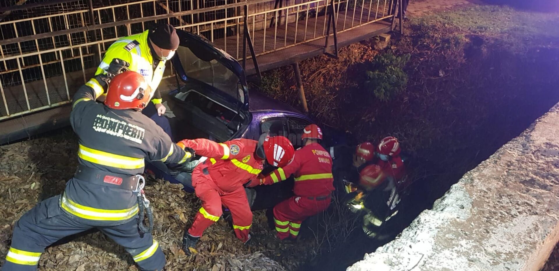 Pompierii militari de la Fălticeni au intervenit la un accident rutier, sâmbătă seară, în jurul orei 20.30, în comuna Râșca, unde un autoturism scăpat de sub control de șofer a lovit un cap de pod, după care s-a răsturnat în albia unui pârâu. Echipajul de descarcerare al Detașamentului de pompieri Fălticeni a constatat că tânărul de la volan era încarcerat, cu picioarele prinse sub bord, fără a se putea mișca.