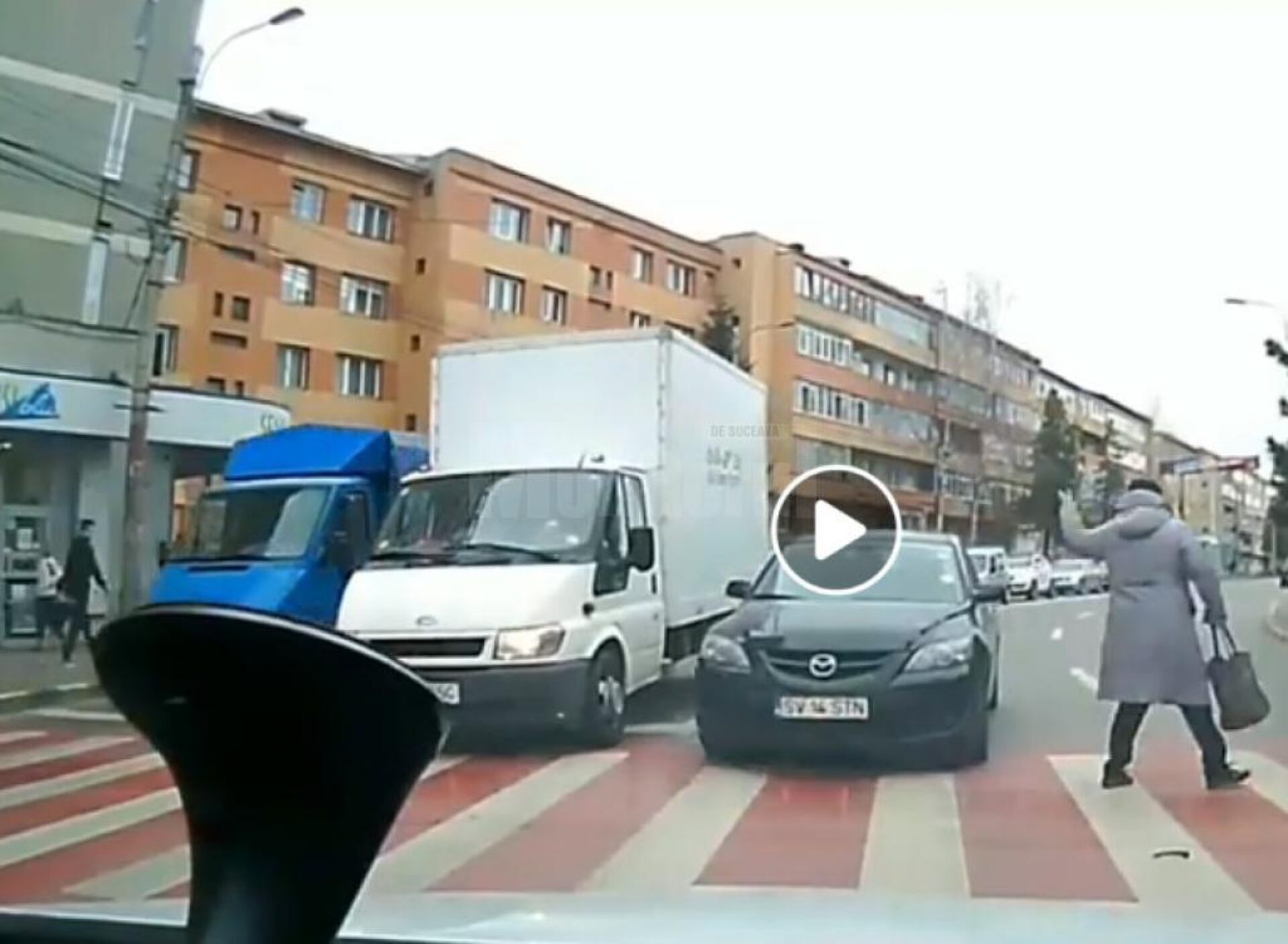 Un incident filmat de camera de la bordul unei mașini, vineri, pe bulevardul principal al Sucevei, la mică distanță de locul unde s-a petrecut un teribil accident mortal anul trecut – jandarmerița cu al său bebeluș, demonstrează încă o dată că inconștiența unora dintre cei care dețin carnet de șofer pune în pericol viața multor altora.