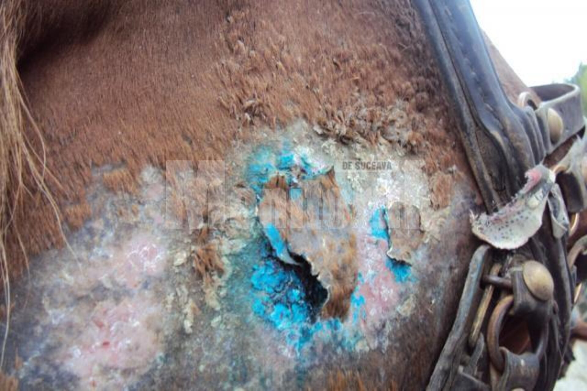 Un cal subnutrit, cu multiple plăgi deschise, care s-a prăbușit la pământ