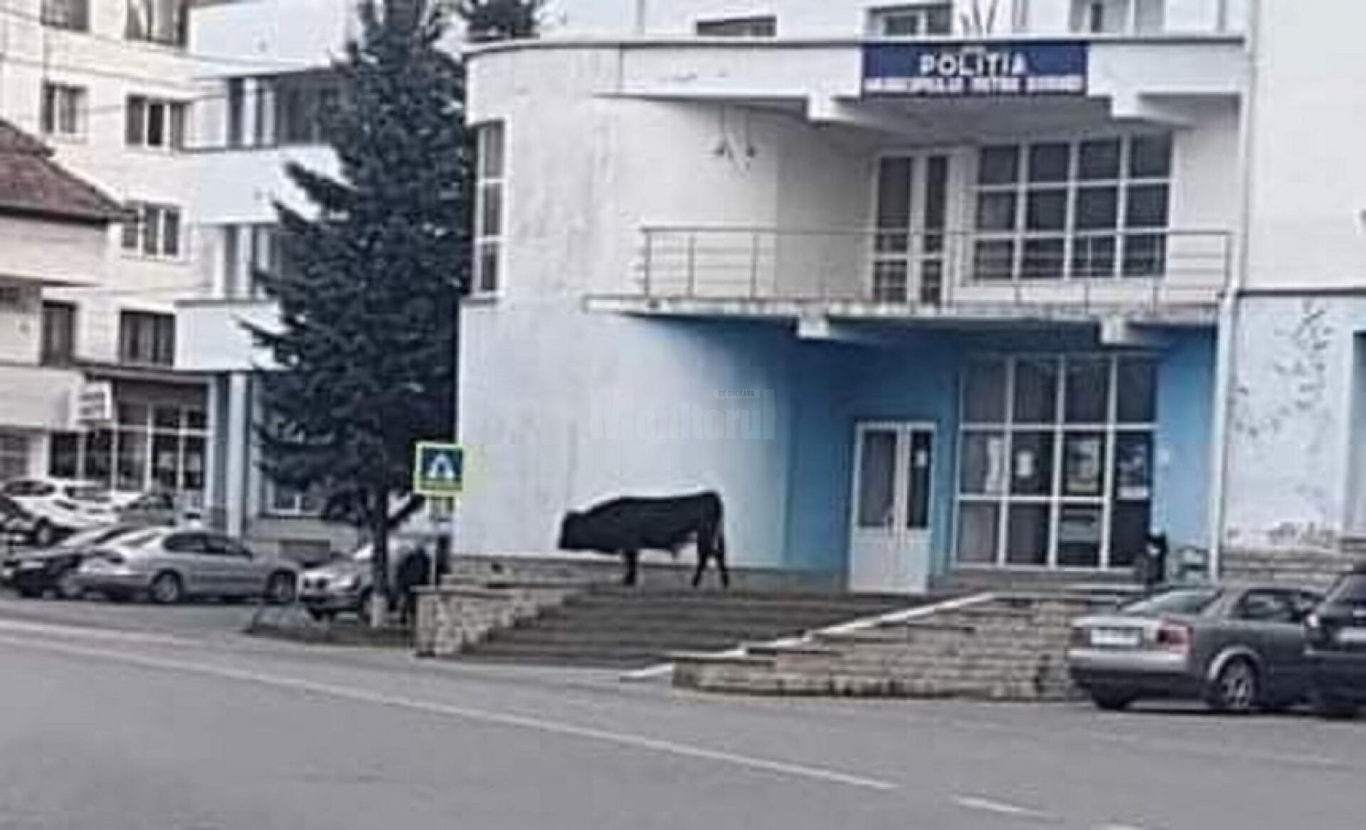 Un taur pe treptele Poliției Vatra Dornei