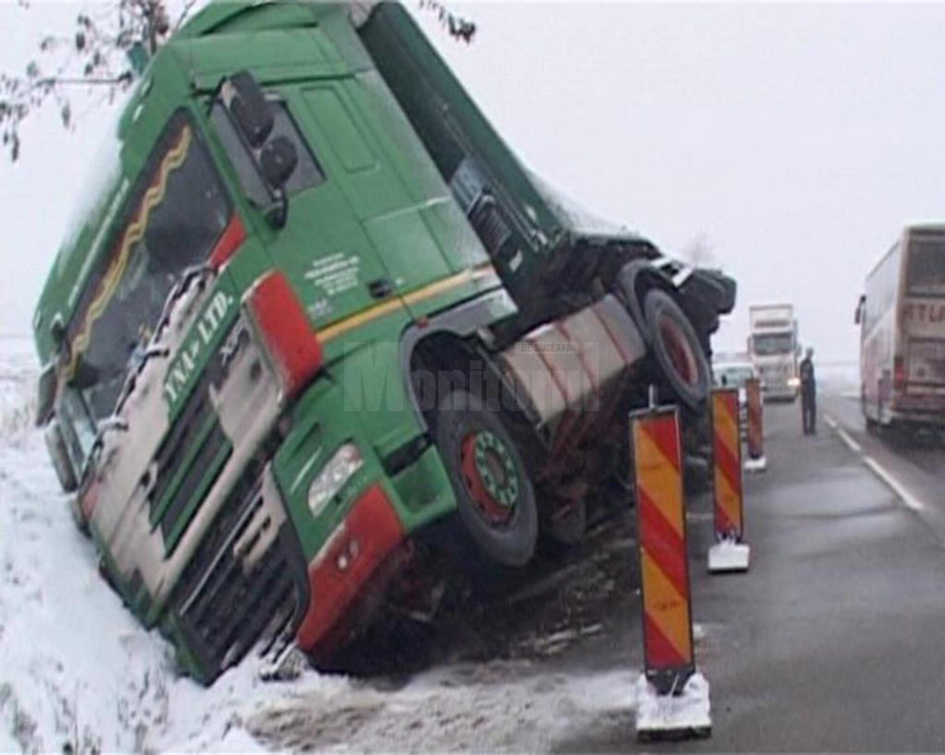 Accidentul nu s-a soldat, din fericire, cu răniți, ci doar cu pagube materiale. Vehiculul greu a perturbat însă circulația, polițiștii dirijând traficul alternativ pe o bandă de mers.