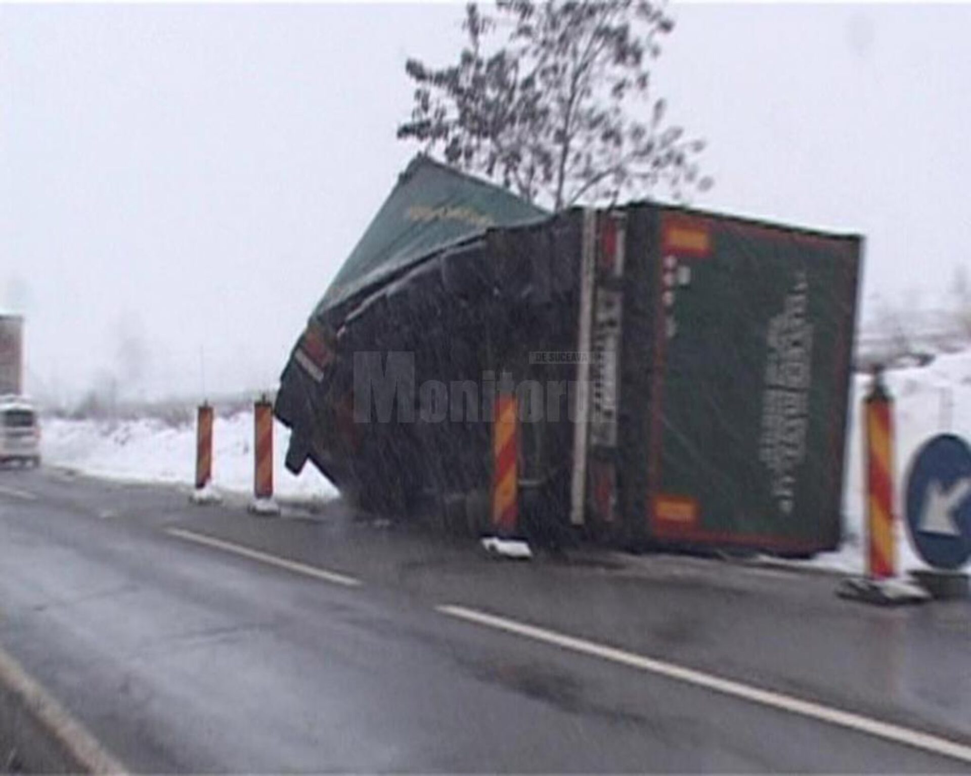 Un tir încărcat cu cereale, care se deplasa spre Ucraina, s-a răsturnat ieri după-amiază pe E 85, între Dărmănești și Dănila, circulația fiind deviată pe un singur sens de mers timp de mai multe ore. Accidentul s-a produs într-o curbă, șoferul ucrainean al vehiculului greu pierzând controlul asupra direcției de mers pe un carosabil ud, în condiții de căderi de zăpadă și aderență scăzută.