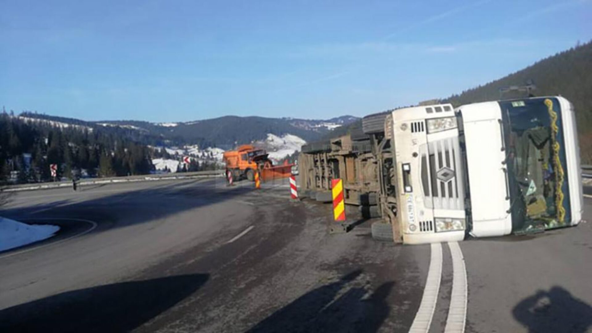 Traficul a fost îngreunat sâmbătă după-amiază în zona Pasului Mestecăniș, după ce un tir s-a răsturnat într-o curbă și a blocat o bandă de circulație. Cel mai probabil din cauza vitezei neadaptate, șoferul camionului intrat în curbă nu a mai putut controla mașina de mare tonaj, care s-a răsturnat pe partea stângă, pe una din benzile de circulație ale șoselei. Zona producerii accidentului a fost semnalizată corespunzător de un echipaj al Direcției Regionale de drumuri și Poduri Iași. La locul accidentului a fost așteptată sosirea unei macarale de mare tonaj, care a reușit tractarea tirului și degajarea zonei. Polițiștii ajunși la locul accidentului au demarat cercetările pentru a stabili modul în care s-a produs acesta. Din fericire șoferul autocamionului de mare tonaj nu a fost rănit.