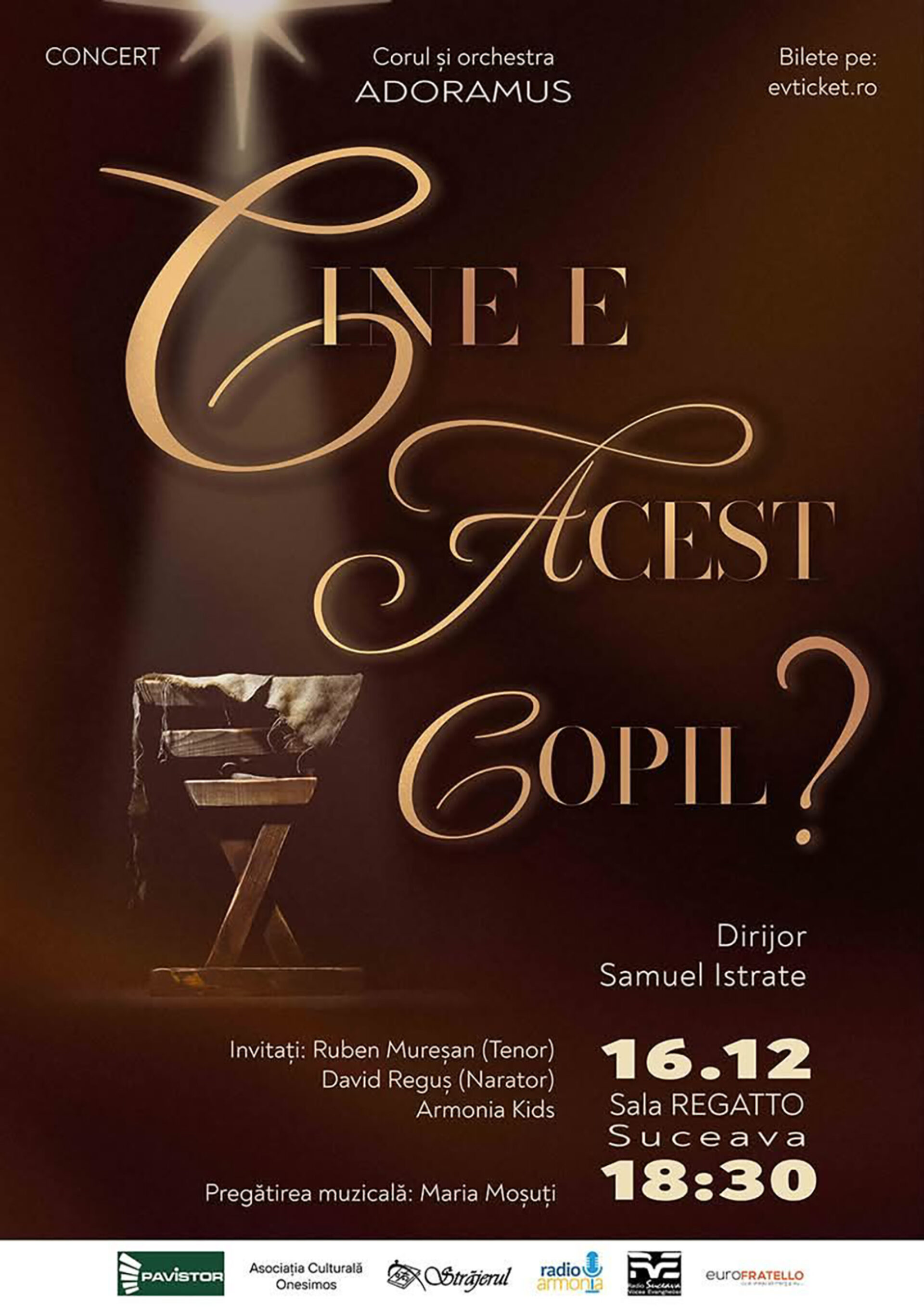 La Suceava, un concert vocal – simfonic de poveste. Marți, 16 decembrie 2025, ora 18.30, în sala Regatto a hotelului Mandachi. Corul și orchestra Adoramus și corul de copii Armonia Kids, tenorul Ruben Mureșan și alte voci surpriză. Bilete pe evticket.ro.