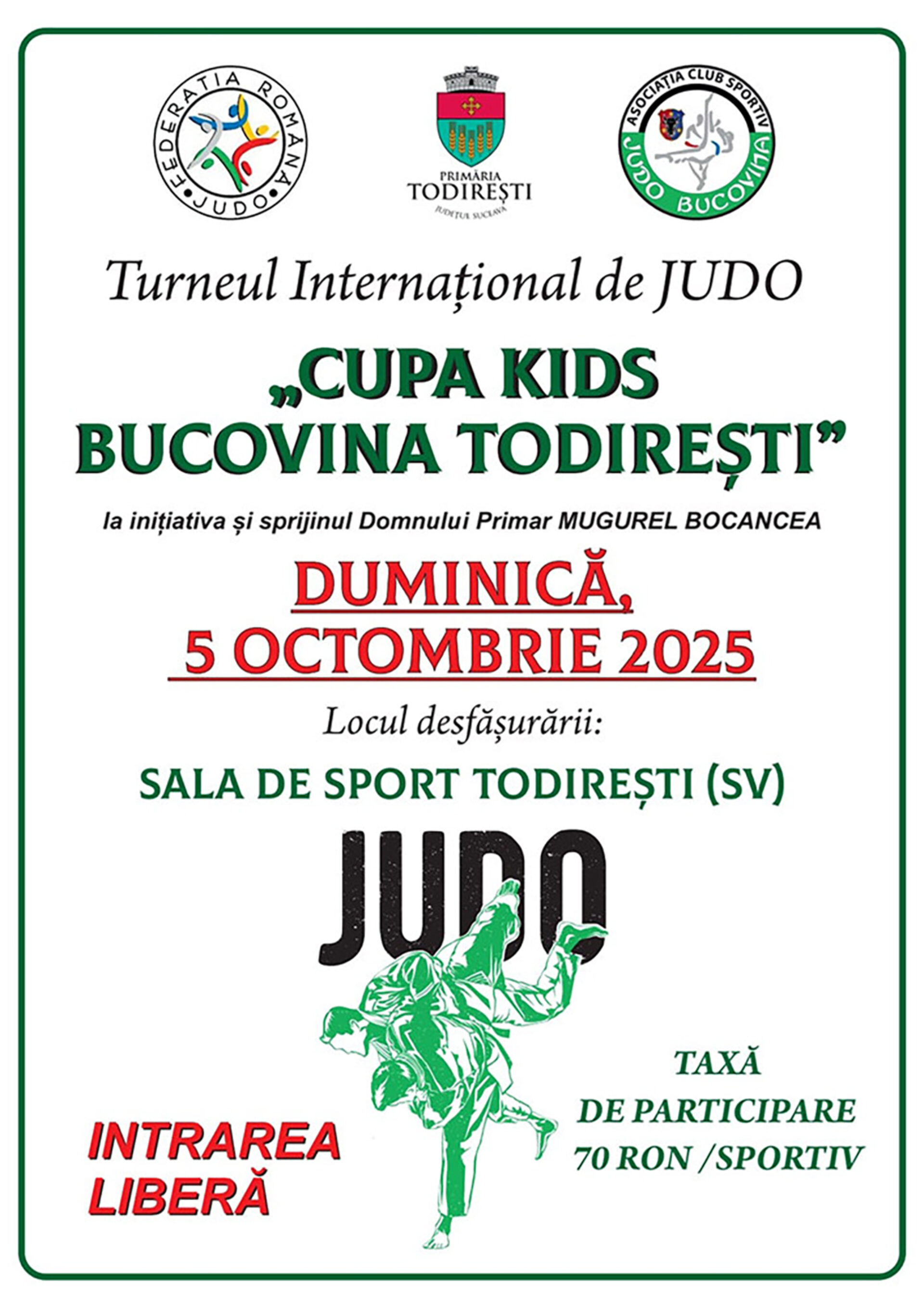 În Sala de sport a comunei Todirești va avea loc, în perioada 4–5 octombrie 2025, ediția a II-a a competiției internaționale de judo Cupa Kids Bucovina – Todirești.