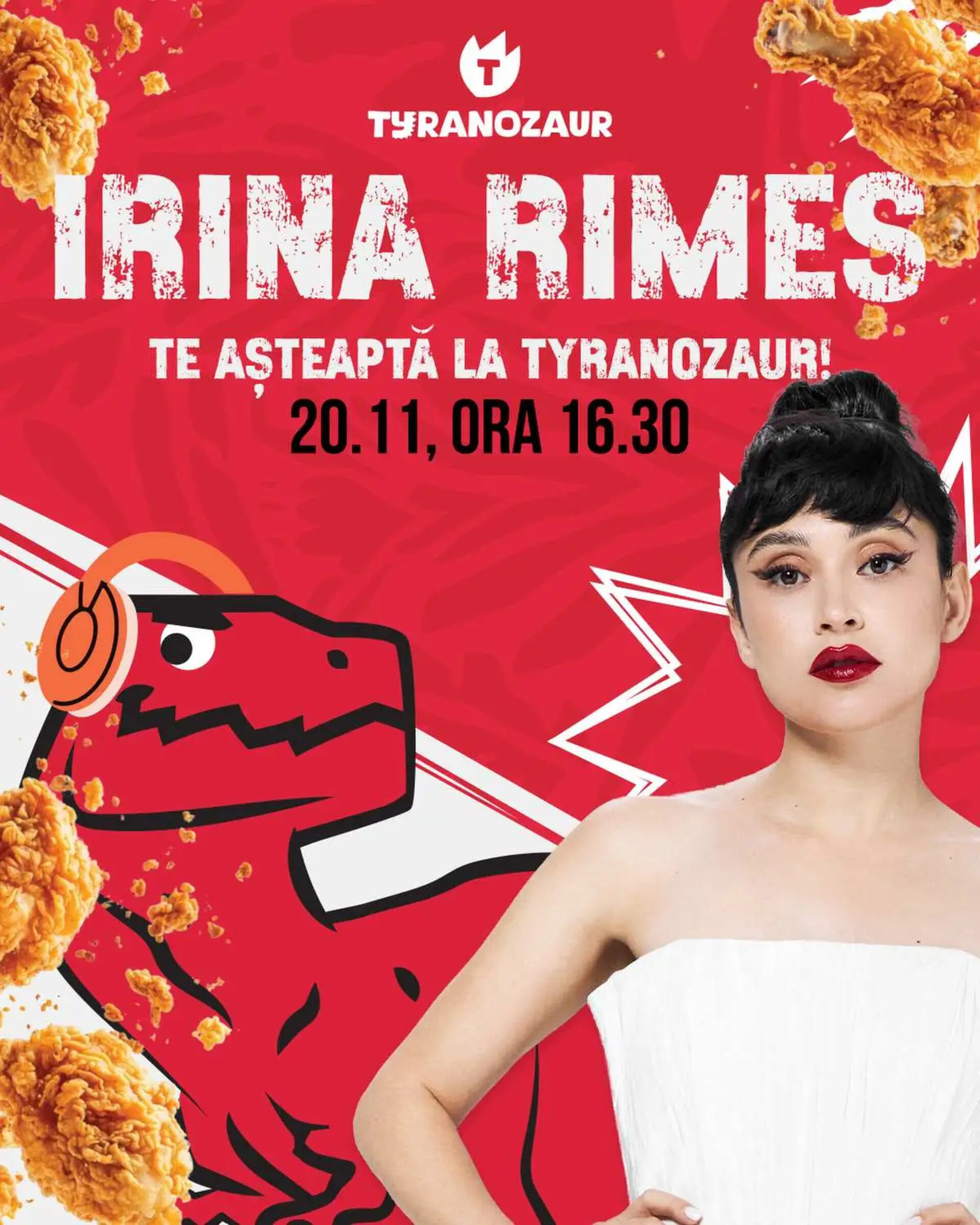 Irina Rimes vine la Suceava pe 20 noiembrie pentru deschiderea oficială Tyranozaur – un nou fast-food cu identitate vizuală aparte și gusturi care promit să domine scena culinară locală. De la ora 16:30, Irina Rimes îi așteaptă pe fani la o sesiune specială de meet & greet, oferindu-le ocazia să se fotografieze și să exploreze alături de ea noul spațiu, gândit ca o combinație între urban food și vibe creativ. Gust, muzică și vibe bun – toate într-un singur loc. Sucevenii sunt așteptați pe 20 noiembrie, începând cu ora 12:00, pe strada Ștefan cel Mare 26, pentru deschiderea oficială Tyranozaur.