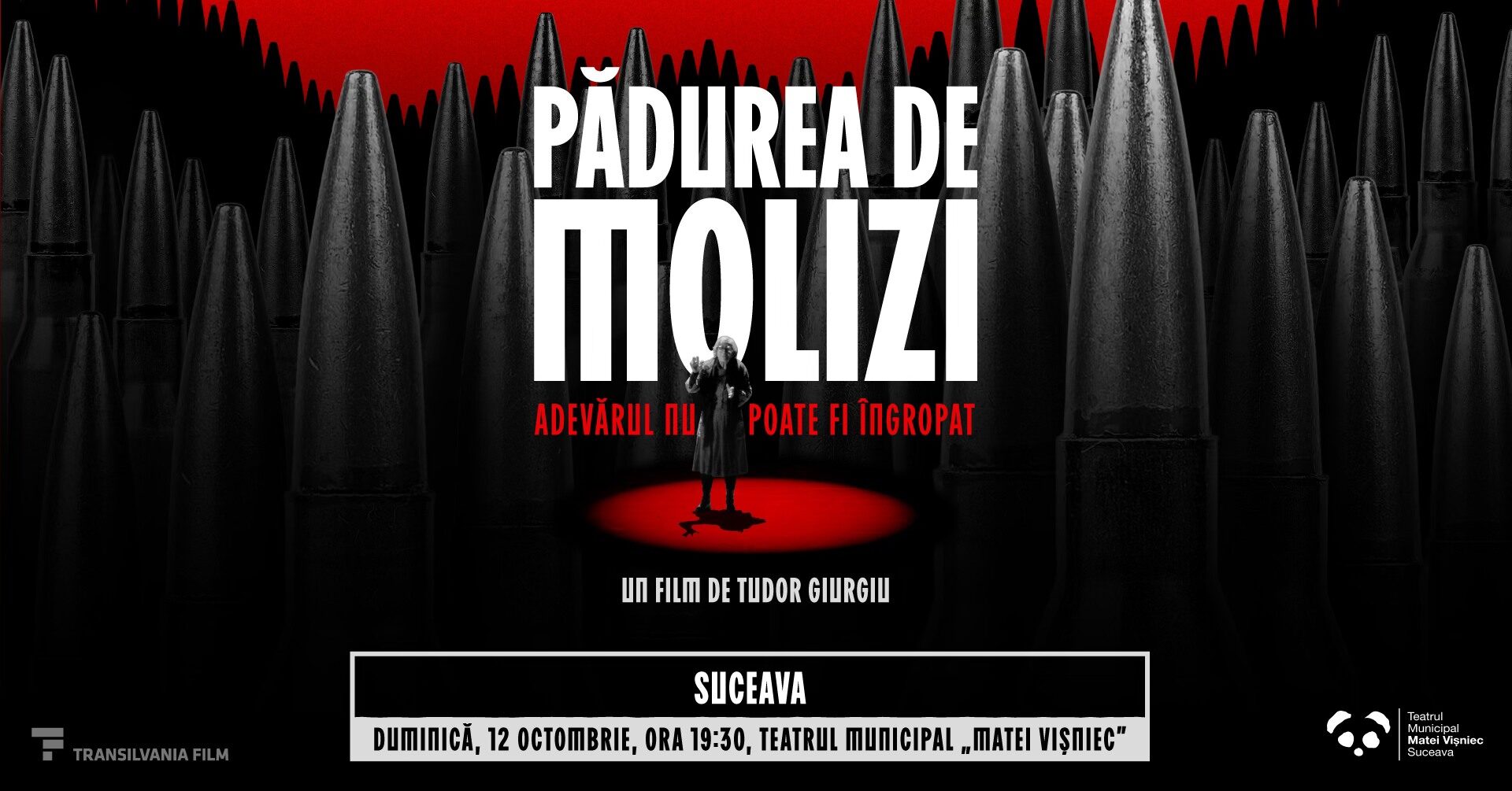 Unul dintre cele mai așteptate filme ale toamnei, ”Pădurea de molizi”, regia Tudor Giurgiu, la Teatrul Municipal „Matei Vișniec” Suceava, duminică, 12 octombrie 2025, de la ora 19:30. ”Pădurea de molizi” (r. Tudor Giurgiu) este inspirat de momentul 1 aprilie 1941, când o comunitate românească din Bucovina de Nord a fost masacrată la Fântâna Albă de către sovietici. Ficționalizând poveștile supraviețuitorilor, filmul readuce pe marele ecran doi dintre cei mai valoroși actori români – Coca Bloos și Mircea Andreescu – într-un tête-à-tête impresionant. Un secret îngropat sub o pădure. Un masacru șters din cărțile de istorie. 2.000 de oameni care au vrut să fie liberi. Inspirat din tragedia reală de la Fântâna Albă din 1941, filmul dezvăluie povestea unei generații condamnate la tăcere și a unei iubiri frânte de deportări și exil. Imagini rare, amintiri și mărturii cutremurătoare, într-un thriller emoționant despre memorie, identitate și supraviețuire. Distribuție: Coca Bloos, Mircea Andreescu, Ionuț Caras.