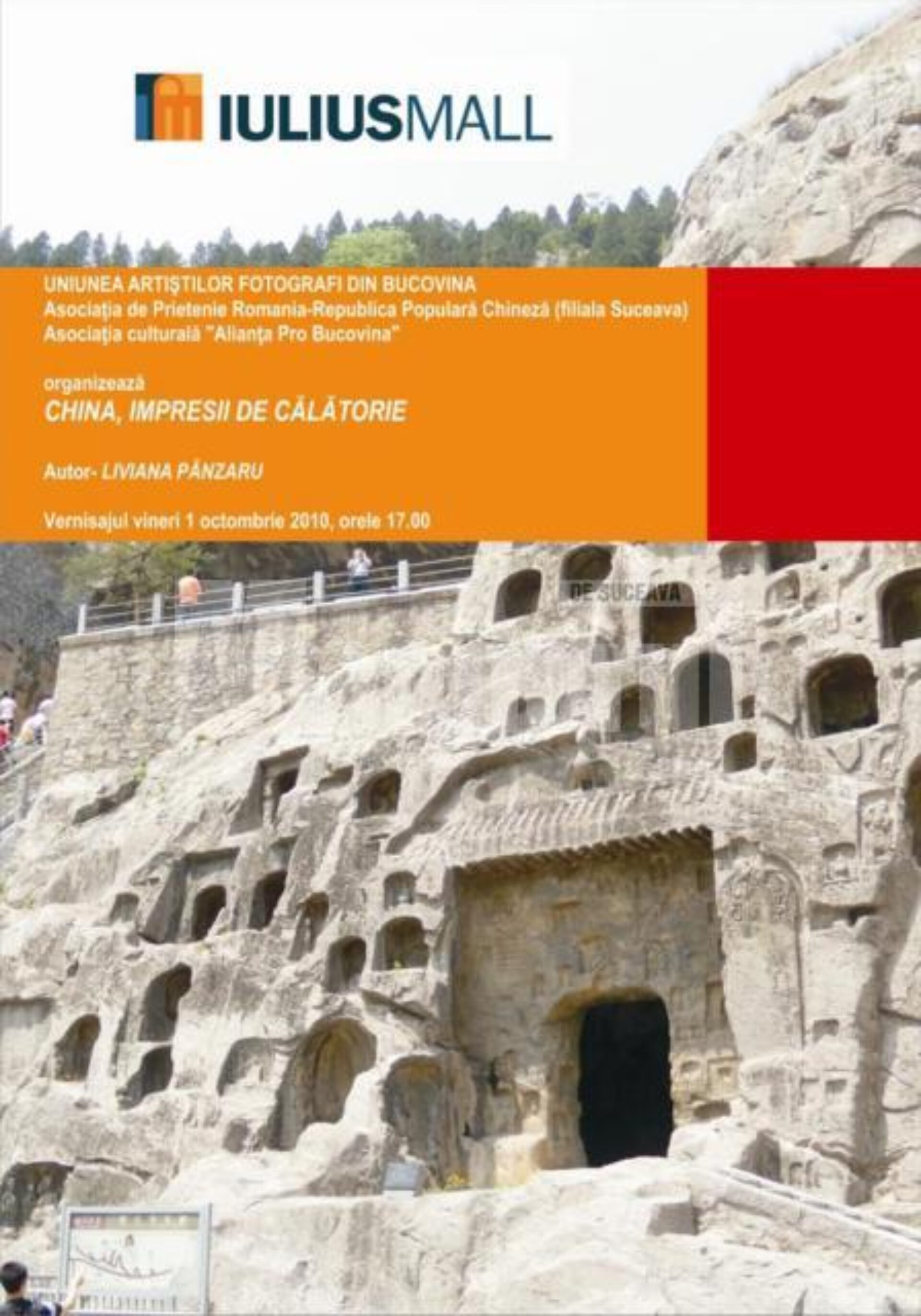 „China, impresii de călătorie” – expoziția de fotografie iscălită de Liviana Pânzaru va sta pe simeze la etajul Iulius Mall până pe 24 octombrie 2010. Partenerii acestui eveniment sunt Uniunea Artiștilor Fotografi din Bucovina, filiala Suceava a Asociației de Prietenie România – Republica Populară Chineză și Asociația Culturală „Alianța Pro Bucovina”.