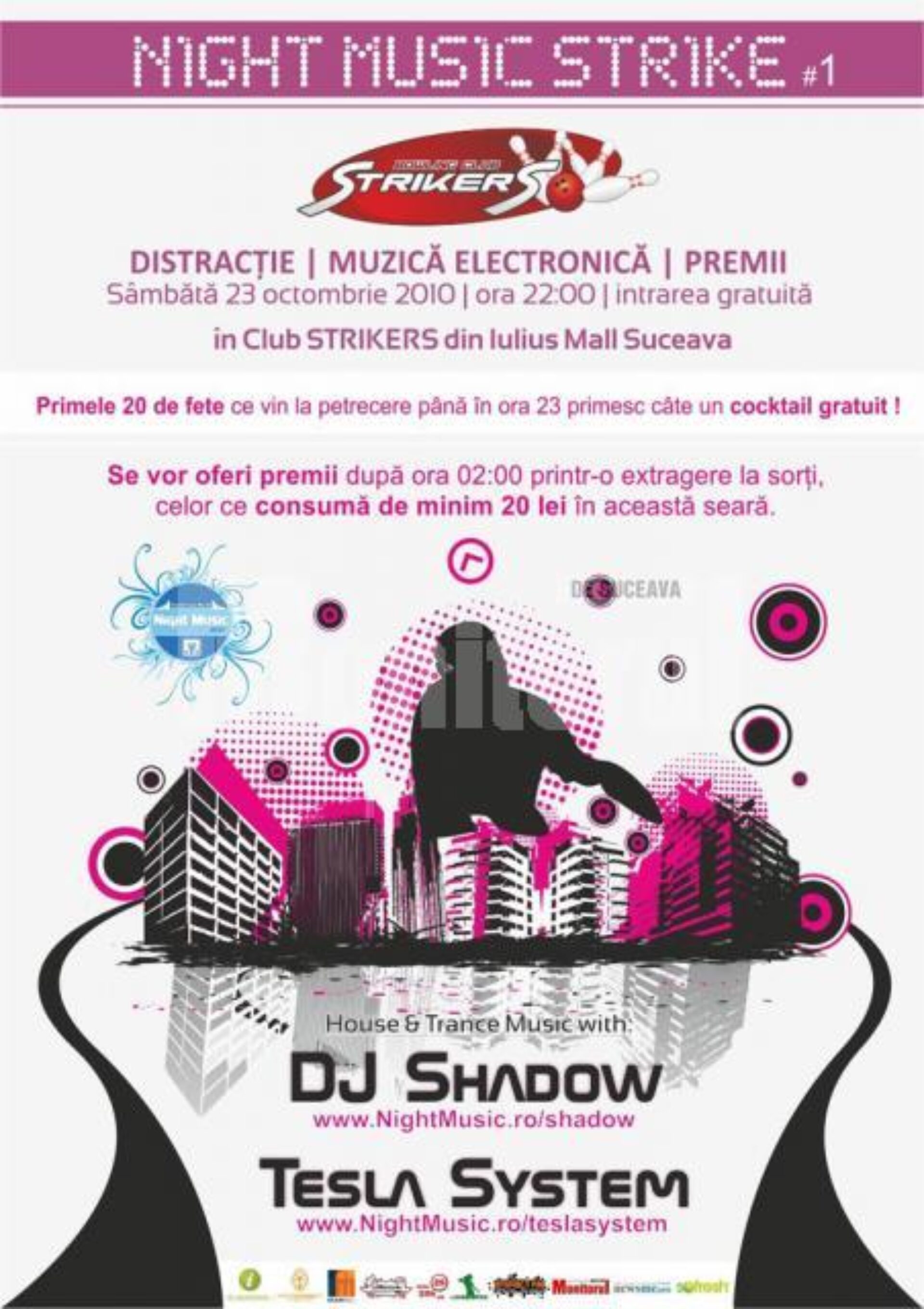 “Night Music Strike”: distracție, muzică electronică, premii! Toate în Bowling Strikers Club, de laora 22:00, cu intrare gratuită. Primele 20 de domnișoare care ajung la petrecere până la ora 23:00, primesc gratuit un cocteil. Până la ora 2:00, organizatorii pun în joc numeroase premii. House and Trance Music: DJ Shadow și Tesla System. Bowling Strikers Club are petrecerea cu cea mai bună muzică!