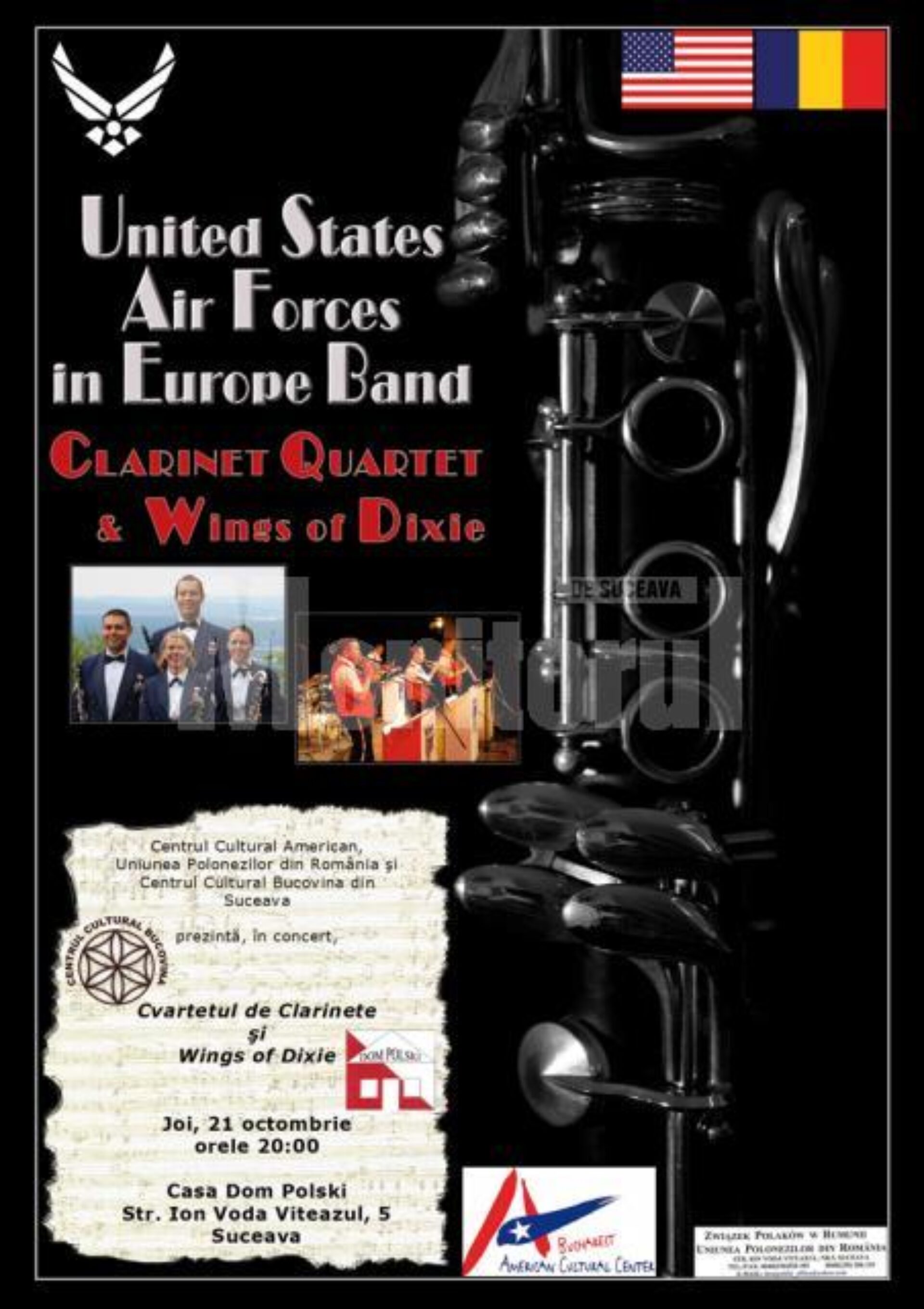 Centrul Cultural American, Uniunea Polonezilor din România și Centrul Cultural Bucovina prezintă în concert extraordinar, joi, 21 octombrie a.c., la ora 20:00, în Sala Dom Polski din municipiul Suceava, Cvartetul de clarinete și Ansamblul „The Wings of Dixie”, din cadrul Orchestrei Forțelor Aeriene Americane staționate în Europa. Intrarea este liberă.