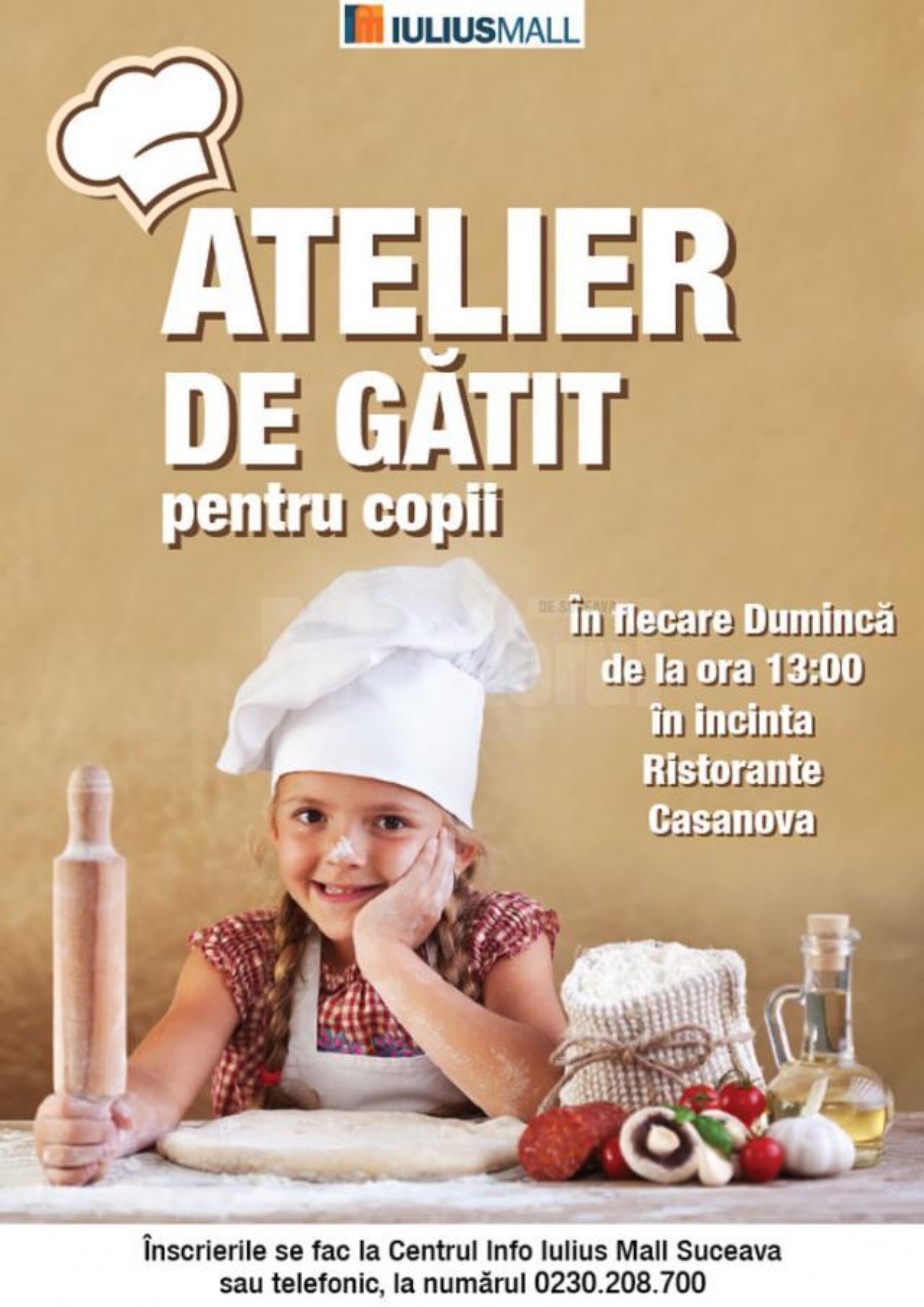 De la ora 13.00, în incinta Ristorante Casanova cei mici vor putea participa la atelierul de gătit. Aceștia vor învăța lucruri noi, prin activități interesante și antrenante, cu tematică culinară. În acest weekend, micii bucătari vor învăța să facă deliciosul preparat italian „pasta al forno”. Echipați cu șorțuri, copiii vor combina ingrediente, vor folosi ustensile specifice și își vor pune în valoare creativitatea. La final, își vor putea testa abilitățile de bucătari, delectându-se cu preparatul realizat chiar de ei. Înscrierile la atelierul de gătit se pot face la Centrul Info Iulius Mall Suceava sau la telefon 0230.208.700, participarea fiind gratuită.