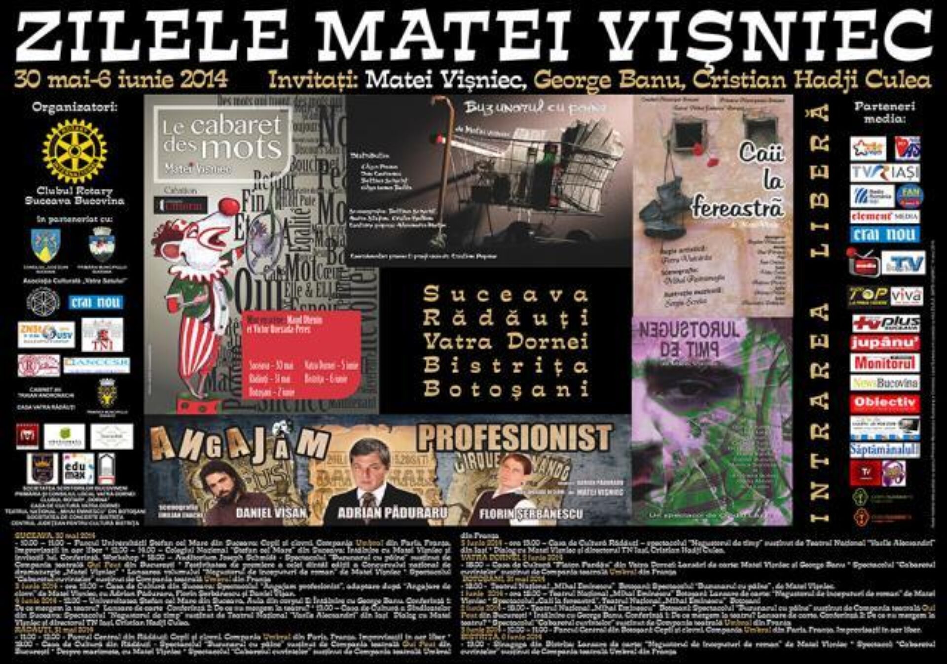 Ora 19.00 – Casa de Cultură din Suceava: Spectacolul „Angajam profesionist”, adaptare după „Angajare de clovn” de Matei Vișniec, cu Adrian Păduraru, Florin Șerbănescu și Daniel Vișan.