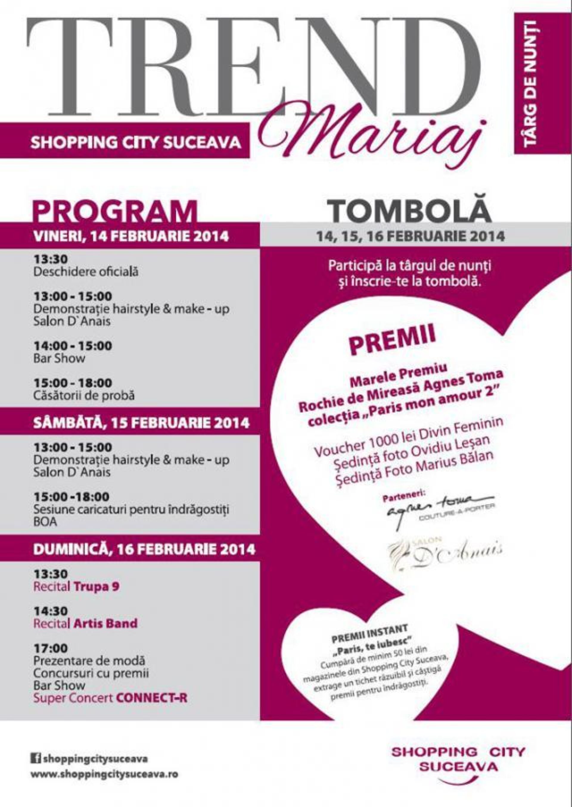Luna februarie este luna nunților și a îndrăgostiților la Shopping City Suceava, care organizează, în perioada 14-16 februarie, târgul de nunți Trend Mariaj, eveniment dedicat viitorilor miri. Dacă îți dorești o nuntă de vis și vrei să te pregătești pentru cel mai așteptat moment din viața ta, te invităm la târgul de nunți din incinta Shopping City. Fie că îți dorești să pui la punct ultimele detalii ori să alegi o gamă complexă de servicii, expozanții te așteaptă cu ultimele tendințe în domeniul nunților. În cadrul târgului Trend Mariaj organizat de Shopping City vor fi prezentate de la cele mai spectaculoase locații, până la cele mai frumoase rochii de mireasă și cele mai elegante costume de mire. De altfel, nelipsite vor fi și celelalte elemente esențiale pentru o nuntă unică: verighete/bijuterii, decorațiuni sală/aranjamente florale, sonorizare/interpreți, pachete foto/video, invitații, lumini ambientale, make-up și hair-styling, cofetării/patiserii etc. Pe întreaga durată a târgului, vor fi surprize și premii pentru vizitatori. Astfel, cei care participă la târgul de nunți și se înscriu la tombola specială au șansa de a câștiga premii importante puse în joc pentru viitorii miri: marele premiu: rochie de mireasă Agnes Toma, din ultima colecție, intitulată „Paris, mon amour 2”; un voucher în valoare de 1.000 de lei, oferit de Divin Feminin, ce cuprinde o garnitură completă de papetărie pentru nuntă: invitații, carduri pentru bani, meniuri și numere de masă, o ședință foto pentru cuplu, realizată de fotograful Ovidiu Leșan, și o ședință foto pentru viitori miri, oferită de fotograful Marius Bălan. Pe lângă momente artistice și prezentări de rochii de mireasă, costume de mire și ținute de ocazie, expozanții târgului vor oferi reduceri și promoții speciale la încheierea contractelor.