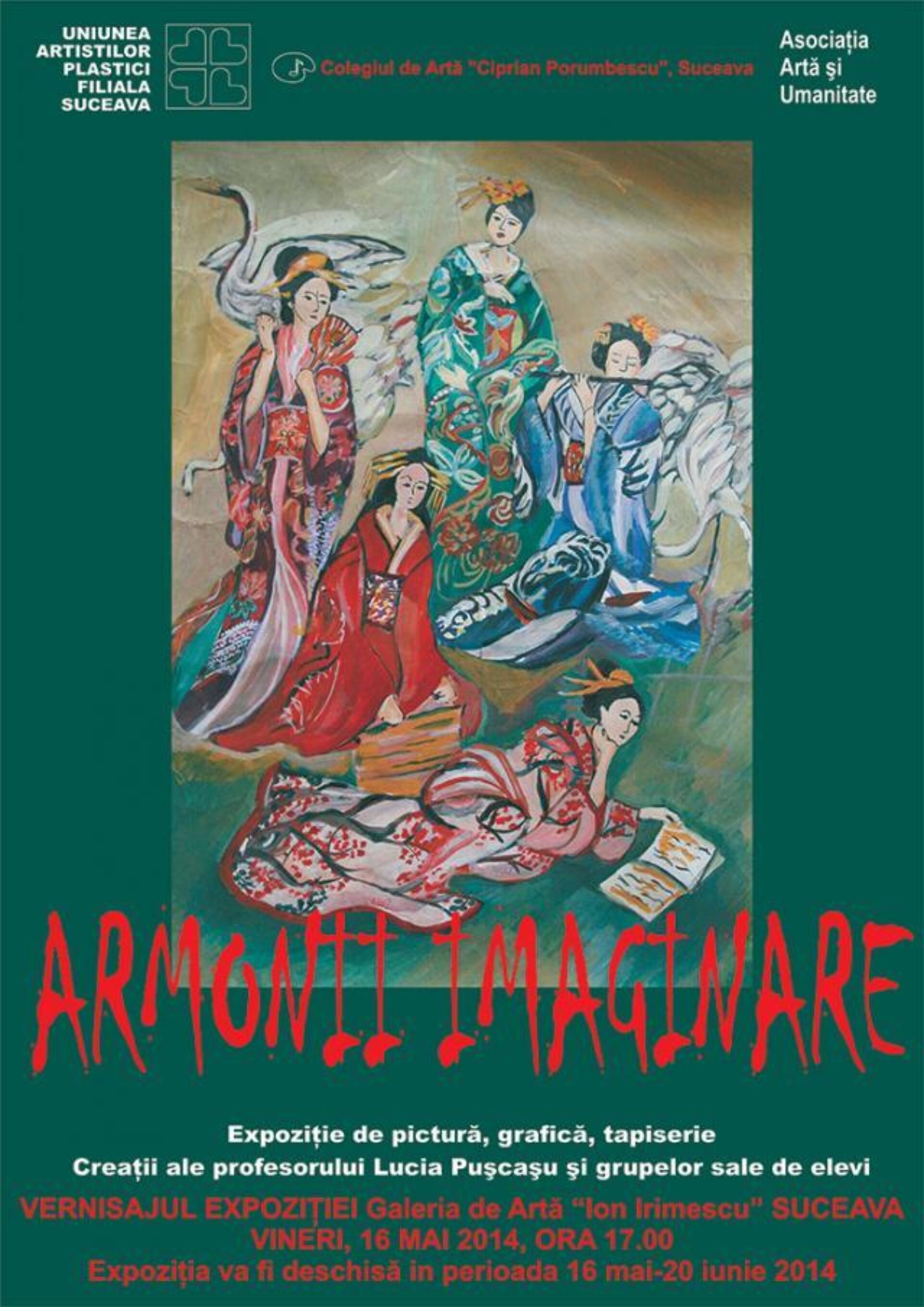 Galeria de Artă „Ion Irimescu” din municipiul Suceava prezintă publicului expoziția de artă plastică „Armonii imaginare”, realizată de artista plastică Lucia Pușcașu și elevii pe care-i coordonează din clasele a VI-a, a IX-a și a X-a de la Colegiul de Artă „Ciprian Porumbescu” Suceava.