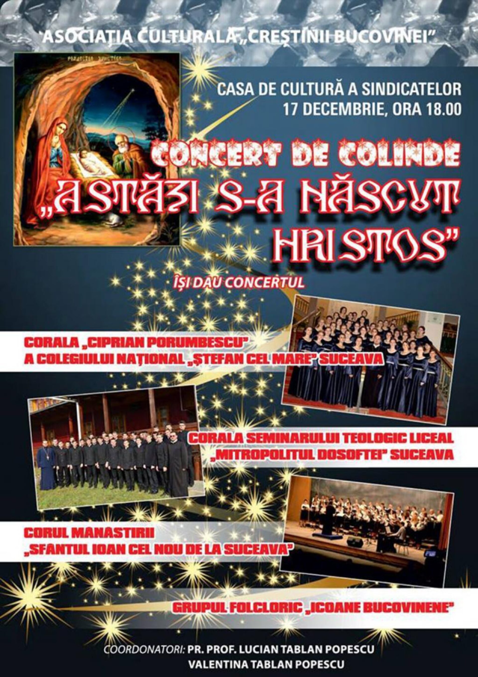 Asociația Culturală ”Creștinii Bucovinei” vă invită la Regalul Extraordinar de Colinde „Astăzi s-a născut Hristos”, organizat la ora 18:00, la Casa de Cultură a Sindicatelor Suceava. Își dau concertul: Corala ”Ciprian Porumbescu” a Colegiului Național ”Ștefan cel Mare” Suceava, Corala Seminarului Teologic Liceal ”Mitropolitul Dosoftei” Suceava, Corul Mănăstirii ”Sfântul Ioan cel Nou de la Suceava” și Grupul Folcloric ”Icoane Bucovinene”. Coordonatori: Pr. prof. Lucian Tablan Popescu și Valentina Tablan Popescu.