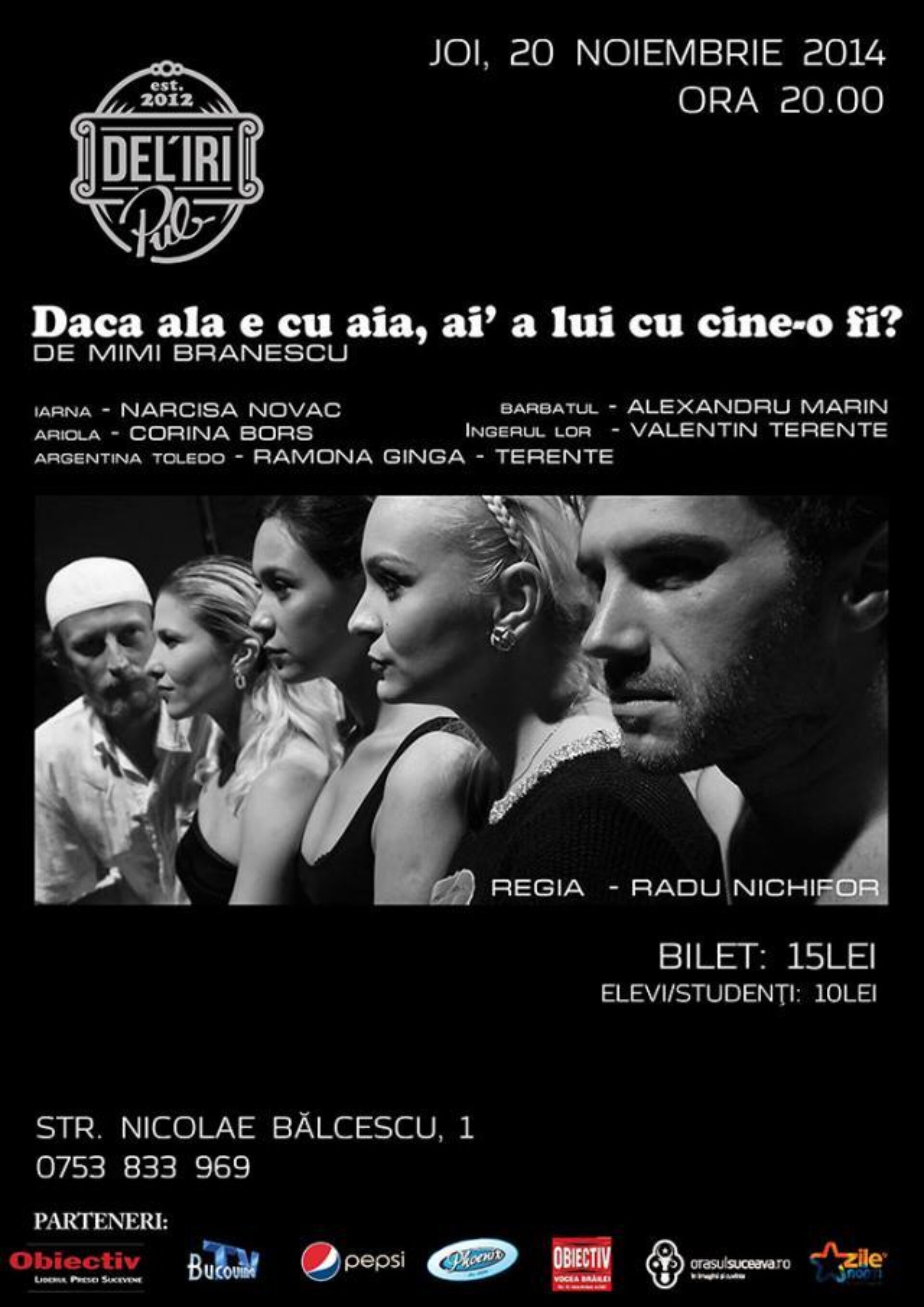Începând cu ora 20:00, Del’Iri Pub Suceava te invită la piesa de teatru „Dacă ăla e cu aia, ai`a lui cu cine-o fi?”. Biletul costă 15 lei, iar pentru elevi și studenți, 10 lei.