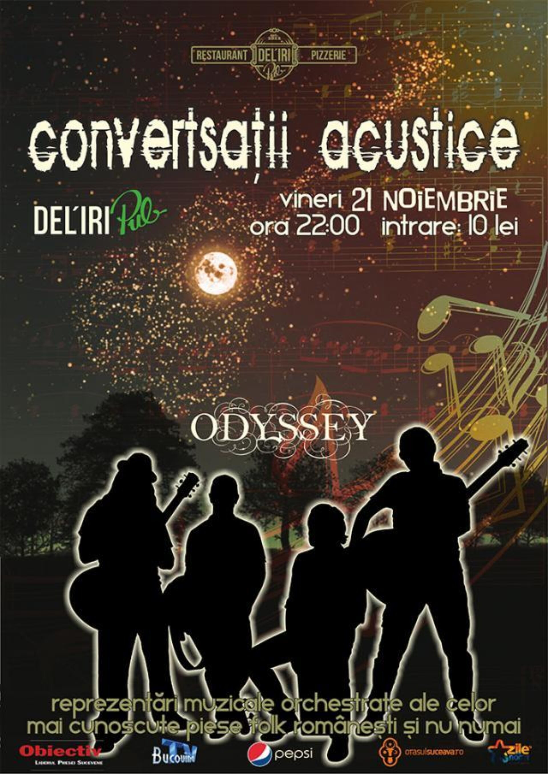 Începând cu ora 22:00, Del’Iri Pub Suceava te invită la concertul Conversații Acustice, susținut de trupa Odyssey. Biletul costă 10 lei.