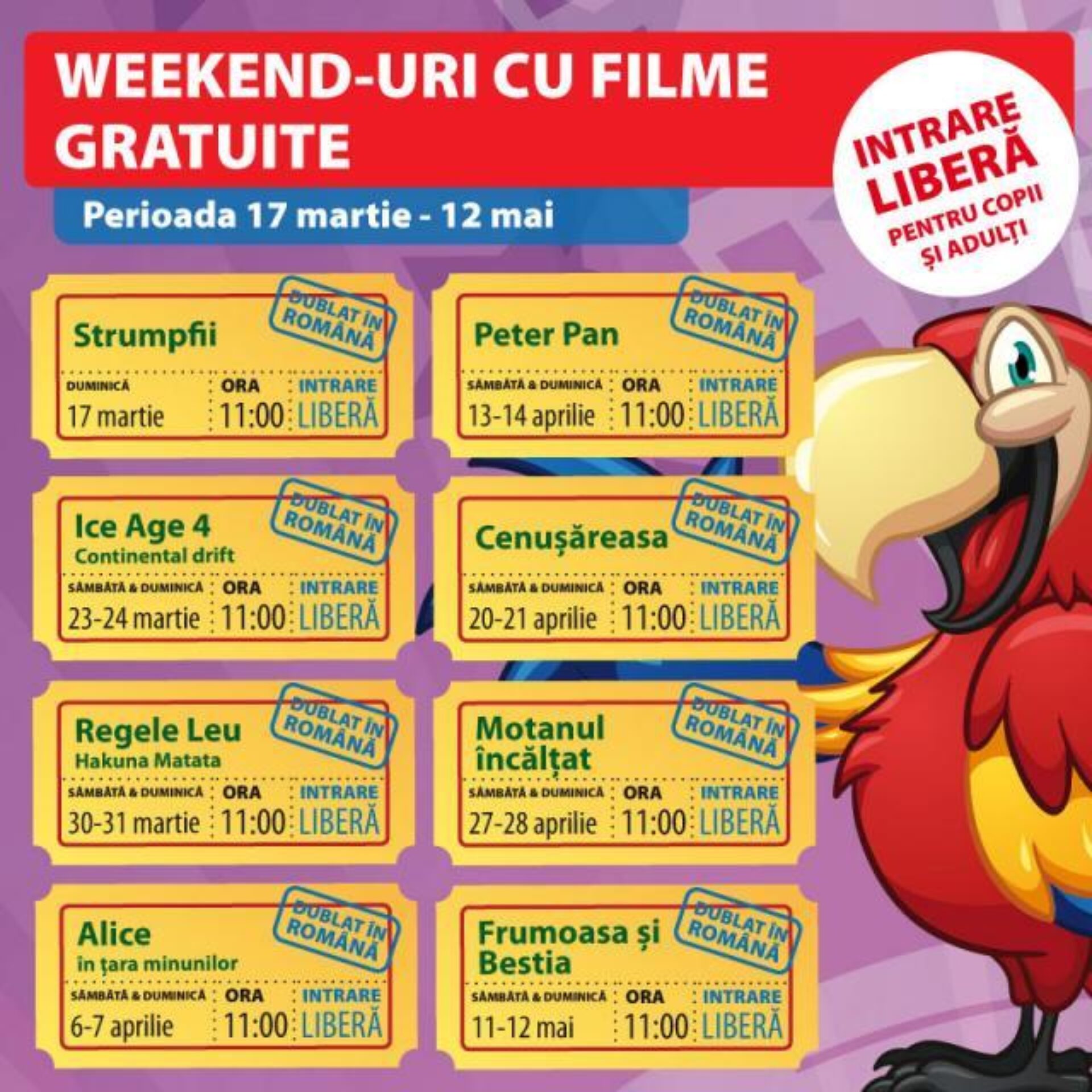 În acest weekend, 6-7 aprilie, până pe 11-12 mai, în fiecare sâmbătă și duminică, de la ora 11:00, copiii sunt așteptați cu filme de animație cu cele mai îndrăgite personaje de desene, toate dublate în limba română.