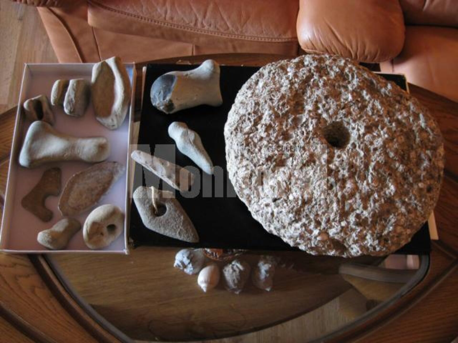 Este vorba de ciocane și topoare din piatră din epoca neolitică, cu urme vizibile de cioplire, sau, dimpotrivă, bine șlefuite, unele dintre ele găurite, precum și o râșniță, un disc din rocă sedimentară cu granulație mare, cu fragmente de cochilii de melci și scoici.