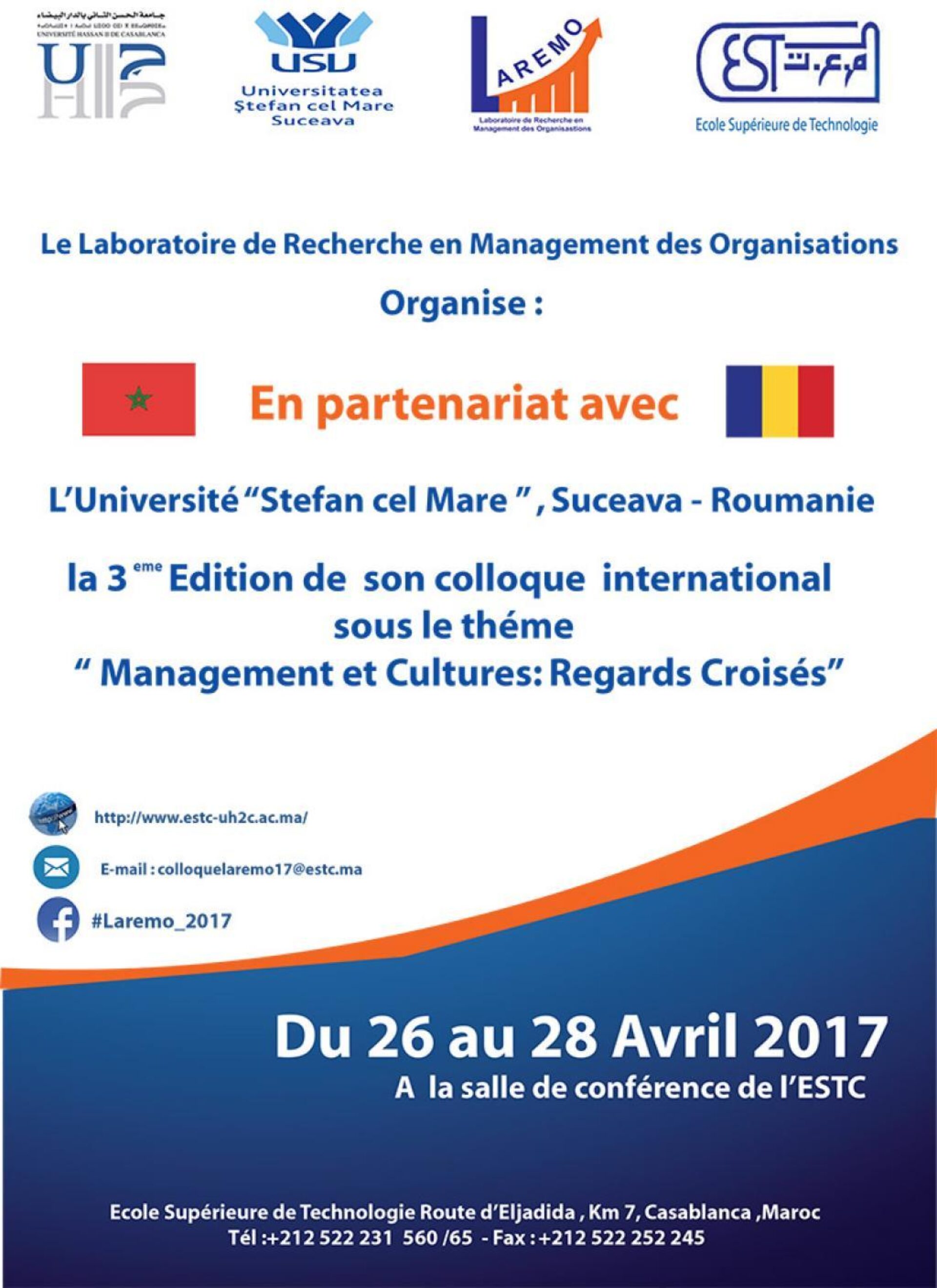 A treia ediție a Colocviului Internațional „Calitate în învățământul superior”, organizat de Universitatea „Hassan II”, Școala Superioară de Tehnologie și LAREMO (Laboratoire de Recherche en Management des Organisations) din Casablanca, Maroc, în parteneriat cu Universitatea „Ștefan cel Mare” Suceava, va avea loc în perioada 26-28 aprilie a.c., la Universitatea „Hassan II” din Casablanca. Tema ediției din acest an este „Management și cultură: Puncte de vedere”.