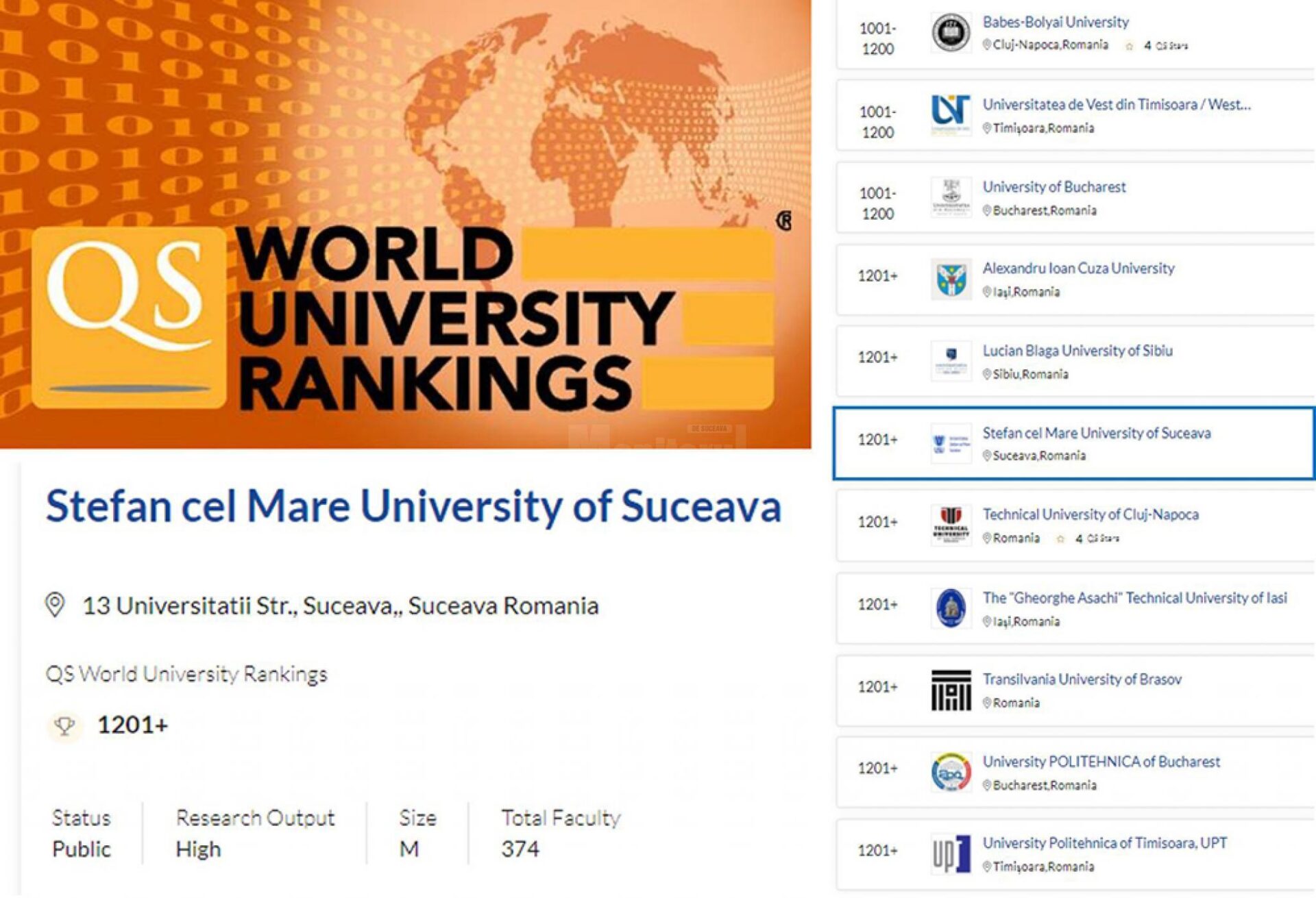 Universitatea „Ștefan cel Mare” Suceava (USV) a intrat în clasamentul mondial al universităților (QS World University Ranking), dat publicității de compania britanică Quacquarelli Symonds. USV este alături de alte 10 universități din România în acest clasament, a anunțat, miercuri, prorectorul USV, prof.univ.dr. Mihai Dimian. Prorectorul Dimian a arătat că trei universități din România se situează între pozițiile 1001 și 1200, iar 8 între pozițiile 1200 – 1300. „Finanțarea acordată de stat în perioada evaluată situează USV pe locurile 22-23 în România, iar celelalte universități din România prezente în top au avut bugete de două ori până la șase ori mai mari decât al USV”, a subliniat profesorul Dimian.